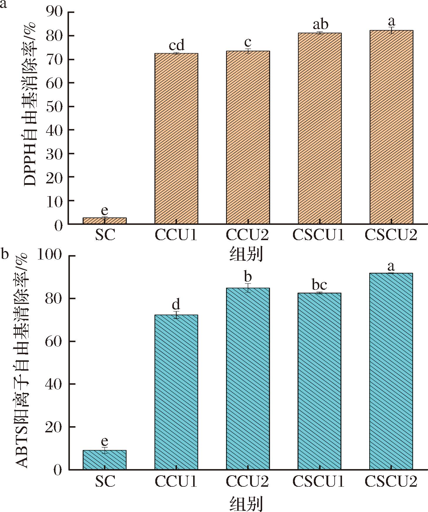 图1显示了不同蔗糖共结晶产物的DPPH自由基和ABTS阳离子自由基清除率,与对照组SC相比,包埋CUR后的共结晶蔗糖均表现出显著的抗氧化活性,且自由基清除率随着CUR在共结晶体系中质量分数的提高而有所增加,这主要与CUR丰富的酚羟基有关[16]。值得注意的是,在相同质量分数CUR的添加量下,CSCU的DPPH自由基和ABTS阳离子自由基清除率均显著高于CCU(P<0.05),表明包埋CUR-SPI的蔗糖共结晶抗氧化效果显著优于单一的CUR共结晶,这可能由于SPI本身含有一些氨基酸和肽段也具有一定的抗氧化能力,能够与CUR产生协同抗氧化效应。