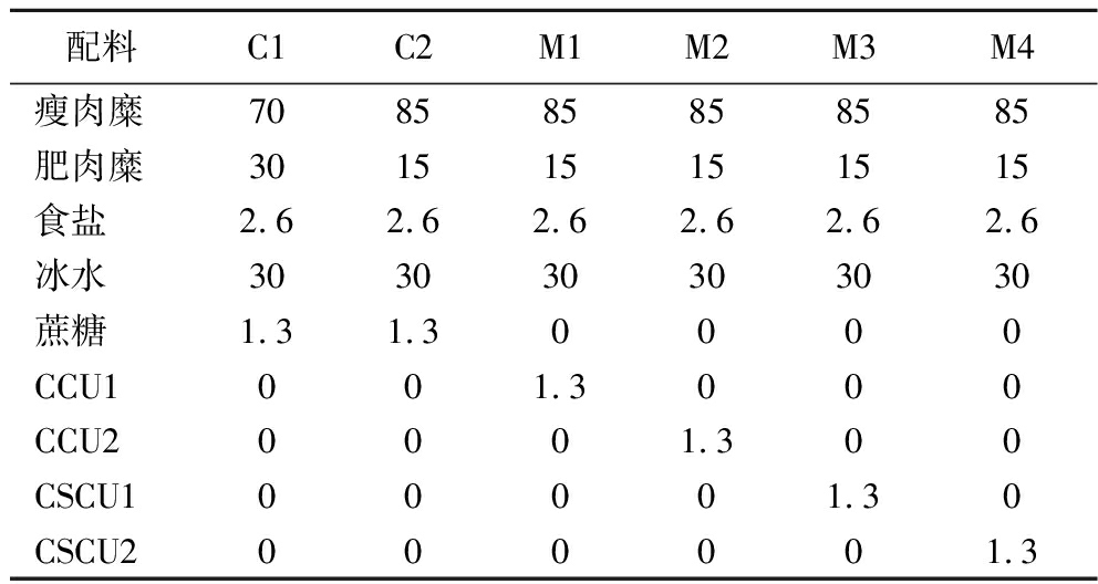 配料C1C2M1M2M3M4瘦肉糜708585858585肥肉糜301515151515食盐2.62.62.62.62.62.6冰水303030303030蔗糖1.31.30000CCU1001.3000CCU20001.300CSCU100001.30CSCU2000001.3