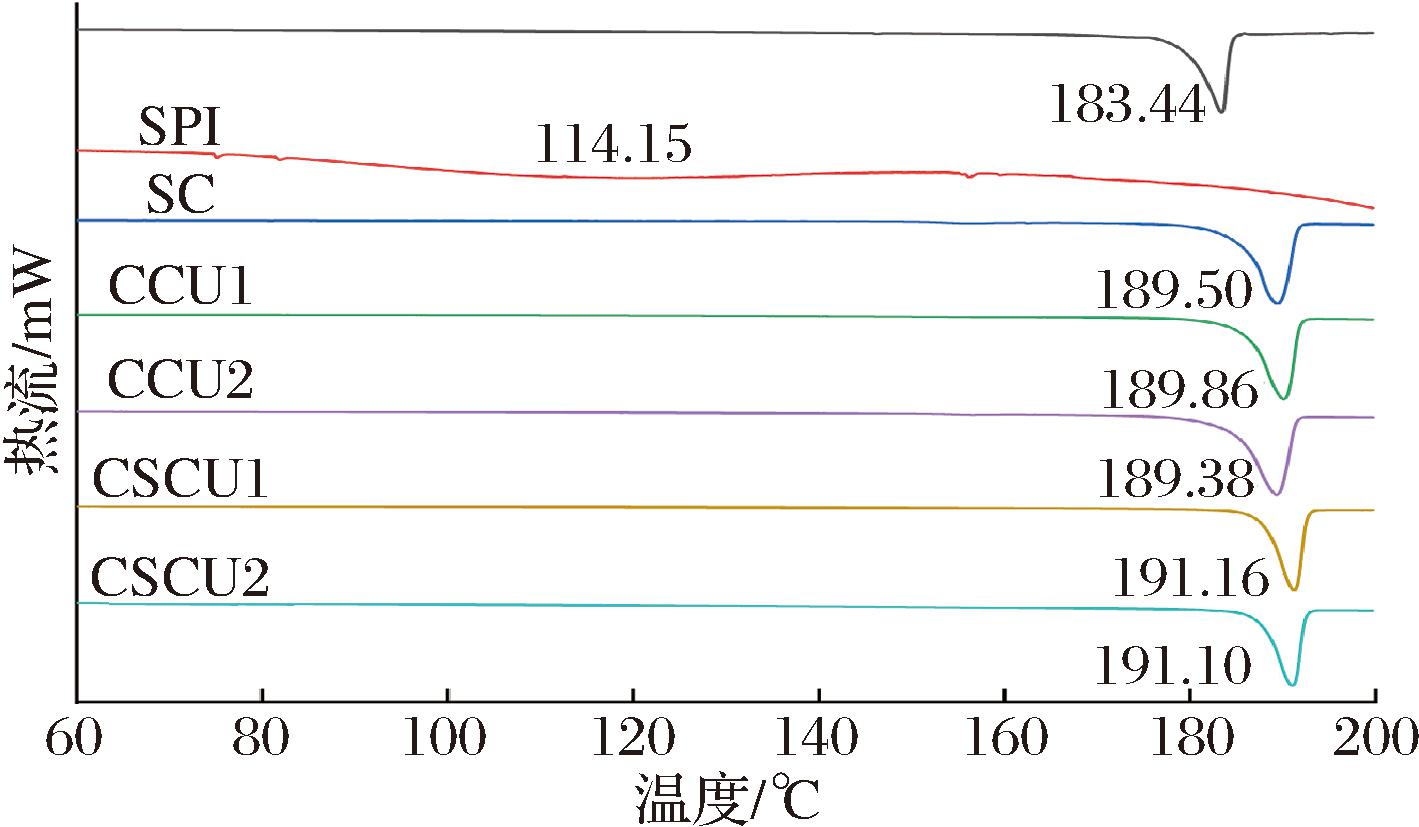 通过DSC表征共结晶过程中壁材和芯材之间可能发生的相互作用及热稳定性的变化。如图2所示, SC在189.5 ℃时出现吸热峰,这对应蔗糖的熔融温度。在包封芯材后,DSC图谱中未观察到CUR和SPI的熔融峰,且未出现二阶相变,表明蔗糖共结晶法能够极大程度地提高了活性化合物的热稳定性,并保持了蔗糖的晶体结构,这与WANG等[12]的研究结果相似。此外,CSCU的熔融温度大于191 ℃,显著高于CCU与SC,表现出更高的热稳定性,这可能与SC-SPI-CUR的复杂相互作用网络的形成有关,由此极大地稳定了共晶体的结构,使其需要更高的能量才能被破坏。