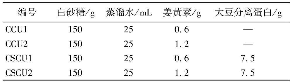 编号白砂糖/g蒸馏水/mL姜黄素/g大豆分离蛋白/gCCU1150250.6—CCU2150251.2—CSCU1150250.67.5CSCU2150251.27.5
