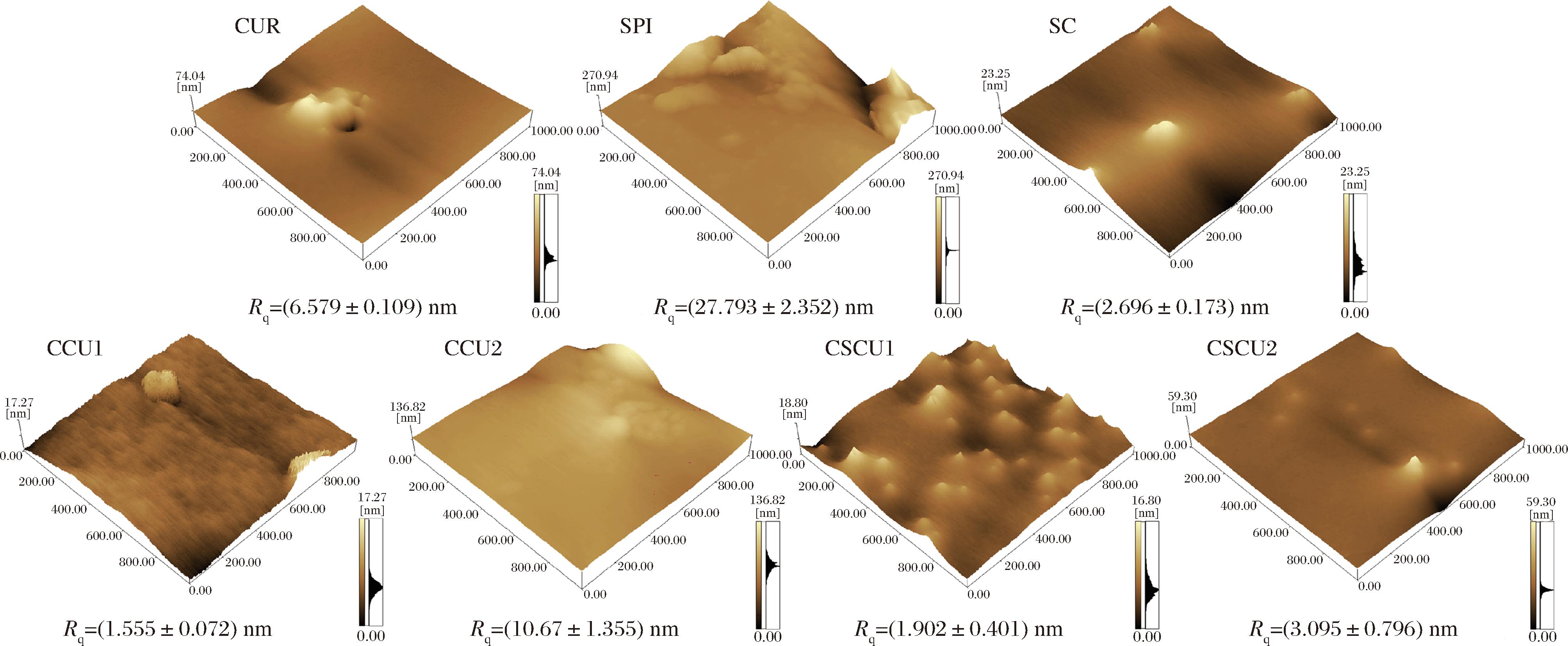 而对CUR-SPI复配物进行共结晶处理,能有效维持且仅轻微增加共结晶产物的Rq值,表明即使在较高质量分数CUR添加下,SPI的存在能够提升共结晶的表面平整度。已有研究显示,较低的表面粗糙度与材料的功能特性强相关[21],这与抗氧化活性、DSC、SEM的结果相互印证。