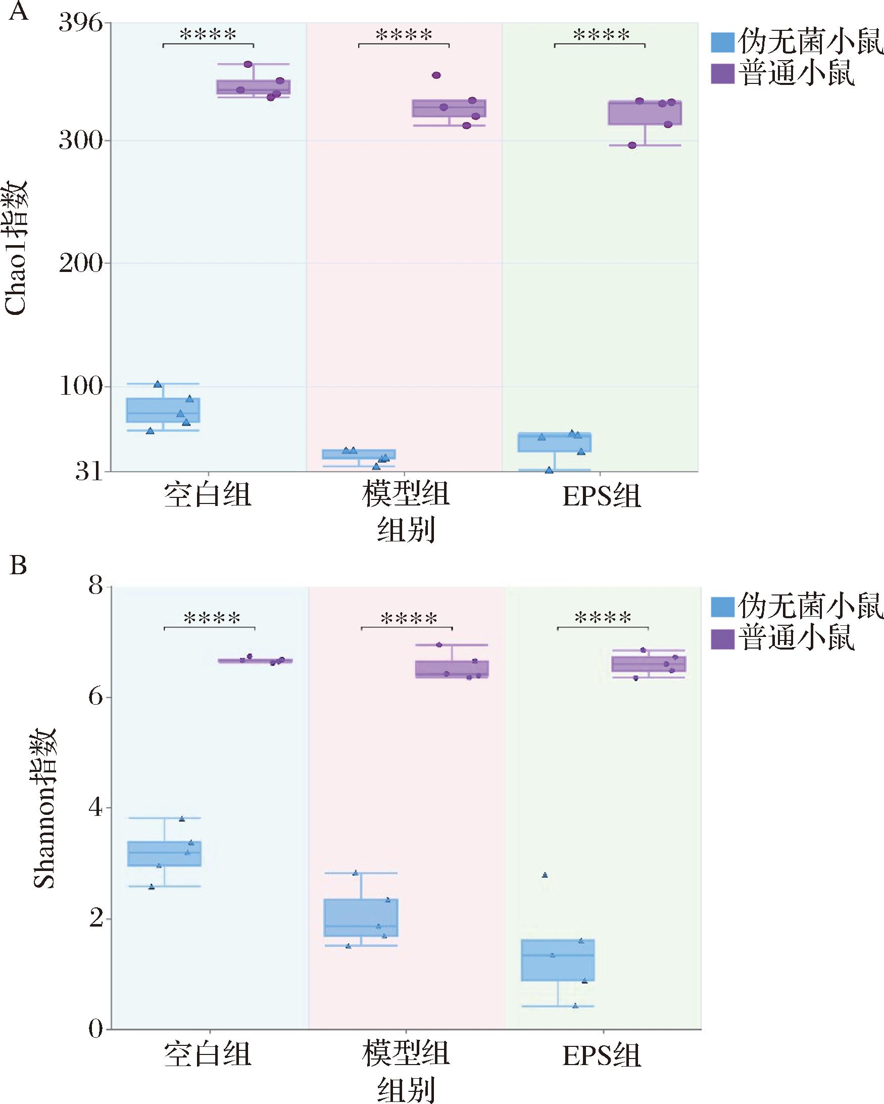 如图7所示,Chao1指数和Shannon指数均显示出伪无菌小鼠在各组中的菌群多样性明显低于普通小鼠,这表明抗生素处理显著降低了肠道菌群的物种丰富度和均匀度。此外,相较于模型组,EPS处理组普通小鼠的Chao1和Shannon指数略有恢复,表明EPS可能对肠道菌群的恢复具有一定的促进作用。