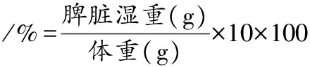 实验第26天,眼部静脉丛取血后应颈椎脱臼法处死小鼠,后解剖收集胃部、脾、肾肝、肠道组织样本。用生理盐水冲洗小鼠器官后,用滤纸去除残留的水分,然后称重、拍照和测量。器官指数的计算如公式(1)所示: