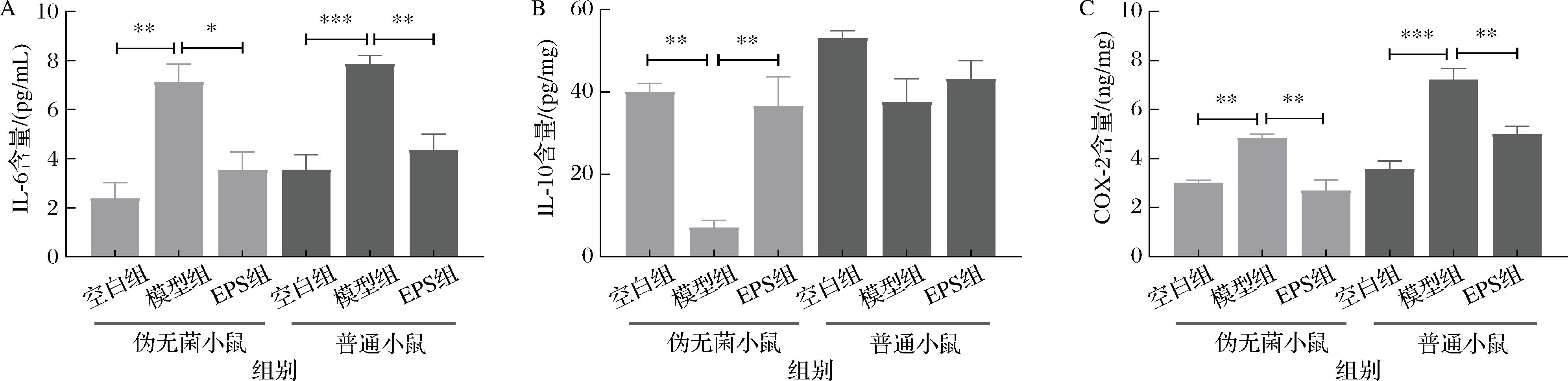 模型组小鼠的COX-2水平显著升高,伪无菌组的COX-2水平升高至4.85 ng/mg,普通组升高至7.23 ng/mg,导致PGE2过量生成,从而加剧炎症反应并延缓胃黏膜的修复。而EPS处理后,COX-2的表达显著降低,分别降至2.70 ng/mg(伪无菌EPS组)和4.98 ng/mg(普通EPS组),减少炎症介质的生成,减轻胃黏膜的炎症程度,并加速了黏膜的修复过程。