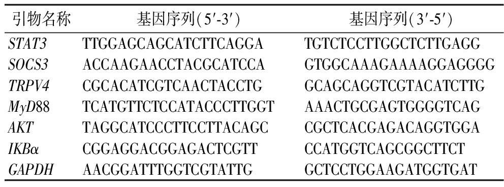 引物名称基因序列(5′-3′)基因序列(3′-5′)STAT3TTGGAGCAGCATCTTCAGGATGTCTCCTTGGCTCTTGAGGSOCS3ACCAAGAACCTACGCATCCAGTGGCAAAGAAAAGGAGGGGTRPV4CGCACATCGTCAACTACCTGGCAGCAGGTCGTACATCTTGMyD88TCATGTTCTCCATACCCTTGGTAAACTGCGAGTGGGGTCAGAKTTAGGCATCCCTTCCTTACAGCCGCTCACGAGACAGGTGGAIKBαCGGAGGACGGAGACTCGTTCCATGGTCAGCGGCTTCTGAPDHAACGGATTTGGTCGTATTGGCTCCTGGAAGATGGTGAT