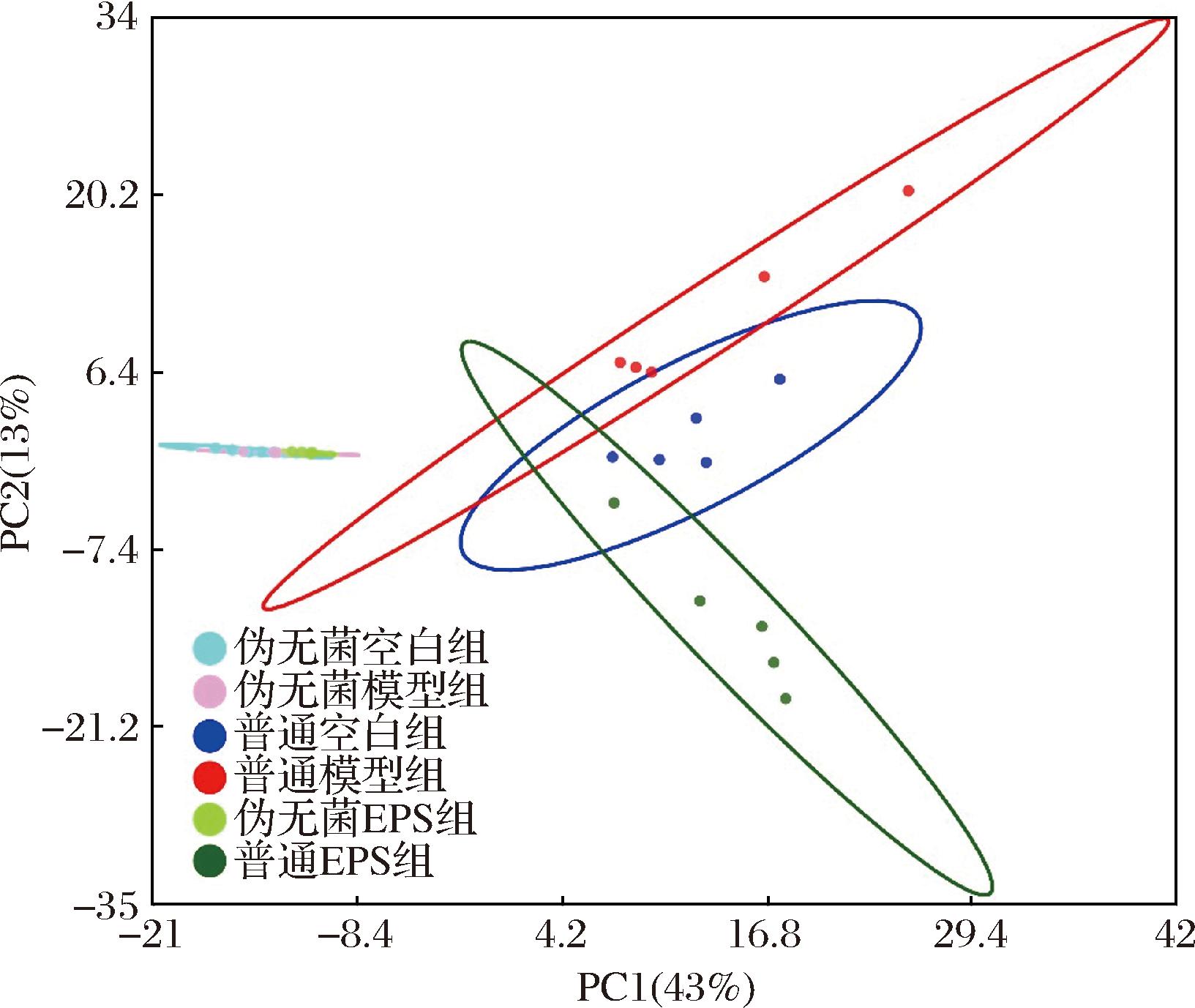 根据样本的OTU丰度进行PCA,结果如图8所示,伪无菌小鼠组别的差异并不大,肠道菌群的变化可能受限于小鼠的伪无菌处理,外部因素的干预难以引起显著变化;普通小鼠的各组别的肠道菌群组成有较显著的分离,炎症导致的菌群失调使空白组和模型组有较大差异,和LI等[39]的结果类似,乙酰水杨酸和EPS的处理改变了小鼠菌群结构,EPS可通过调节菌群代谢物或促进有益菌的增殖来修复炎症。