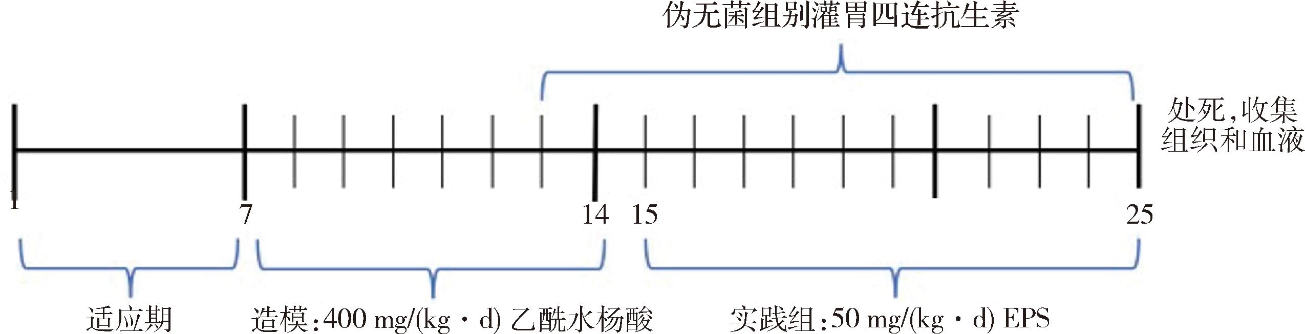 实验小鼠均来自于维通利华公司。动物实验方案已获得江南大学实验动物实验伦理委员会批准(伦理编号为:JN.No20240630b1040811)。将30只Balb/c小鼠随机分为伪无菌小鼠组别和正常小鼠组别,每组15只,2个组别分别包括空白组、模型组和EPS组。乙酰水杨酸诱导的胃炎模型建立过程如图1所示,模型组和EPS组小鼠每天以400 mg/kg的剂量灌胃乙酰水杨酸,连续7 d,诱导Balb/c小鼠的慢性胃炎[14-15],造模完成后,EPS组小鼠每天以50 mg/kg的剂量灌胃EPS,持续10 d,用于修复胃黏膜损伤[16]。另外,伪无菌组别在灌胃多糖的同时灌胃四连抗生素(四联抗生素:万古霉素100 mg/kg;新霉素200 mg/kg;氨苄青霉素200 mg/kg;甲硝唑200 mg/kg),抗生素配方参考既往研究方法[17-19],以验证EPS起效机制。