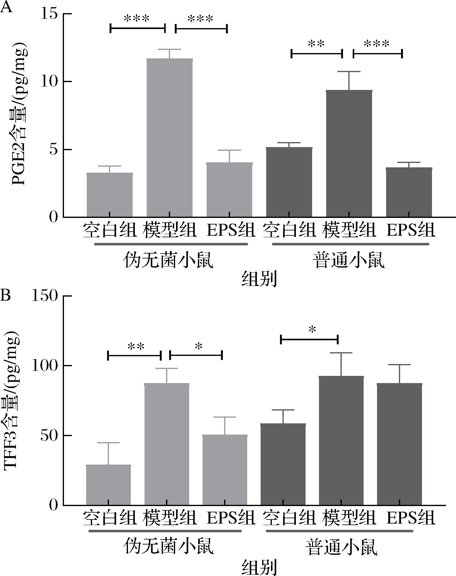 PGE2是前列腺素家族中的一种重要炎症介质,PGE2在维持黏膜屏障完整性、黏液分泌、调节胃血流方面起主要作用[22],可减少胃酸分泌,抑制胃中的炎症和氧化应激,当PGE2水平显著升高时,往往提示炎症反应过度,加重胃黏膜损伤[1,23]。如图4-A所示,相比于空白组(伪无菌空白组、普通空白组:3.28,5.17 pg/mg),模型组的PGE2水平显著上升(11.70、9.37 pg/mg),表明胃炎模型小鼠存在明显的炎症反应,炎症刺激导致PGE2合成增加,提示胃黏膜受到损伤,炎症反应过度激活。EPS能够缓解胃炎引起的炎症反应(4.04、3.69 pg/mg),分别较模型组降低了65.47%和60.62%,改善胃黏膜的炎症状态,促进黏膜修复,这和前人的研究结果相似[24]。