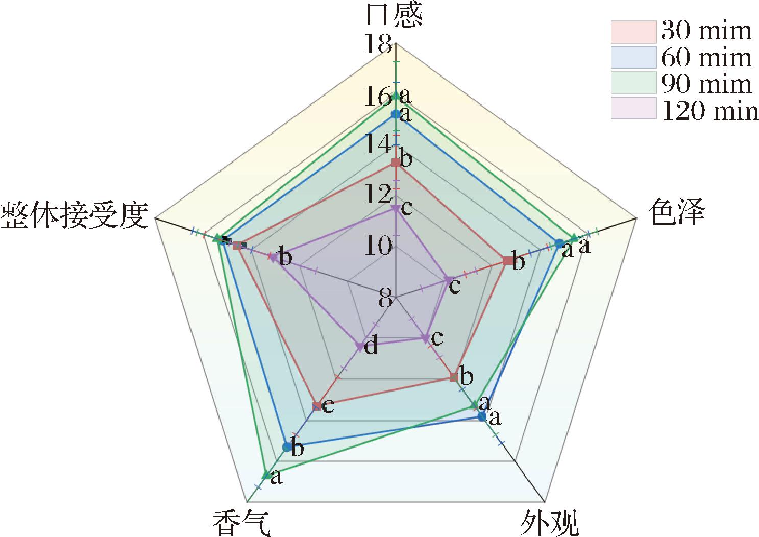 对经过不同熬煮阶段下鹅汤的口感、色泽、外观、香气、整体接受度5个维度开展感官评分,不同熬煮时间的鹅汤被明显区分,结果如图4所示。在30~90 min 过程中加热使鹅汤中蛋白质发生了降解,促使汤汁中游离氨基酸含量上升[21],从而汤汁口感风味更佳。经过60~90 min熬煮的鹅汤,气味浓郁,整体接受度高。60~90 min组在呈现令人愉悦的金黄色,120 min颜色略深。60 min组的外观得分(13.80)高于其他3组,但与90 min组没有显著差异(P>0.05)。此外,对总体可接受性的评估显示,60~90 min组鹅汤口感最佳。