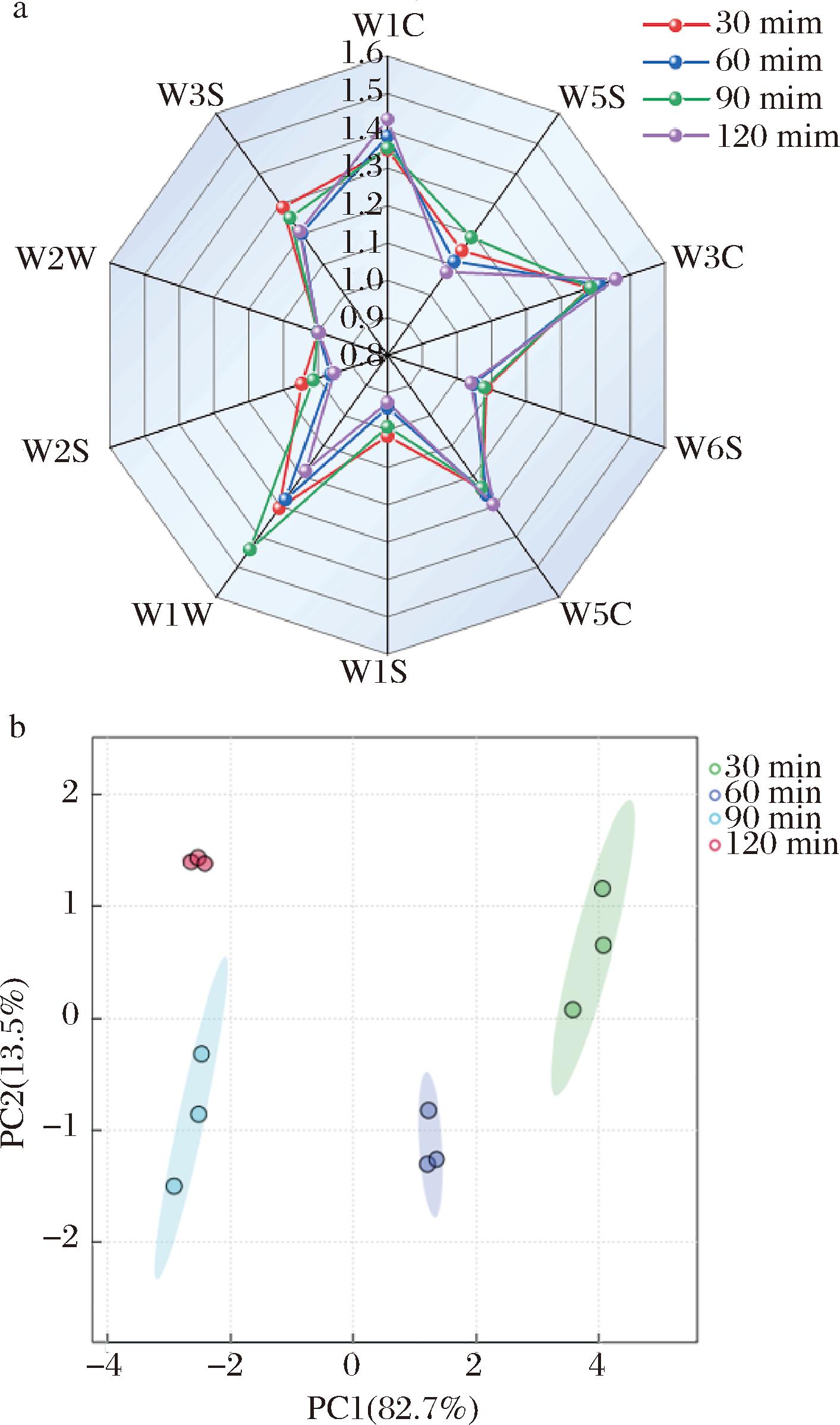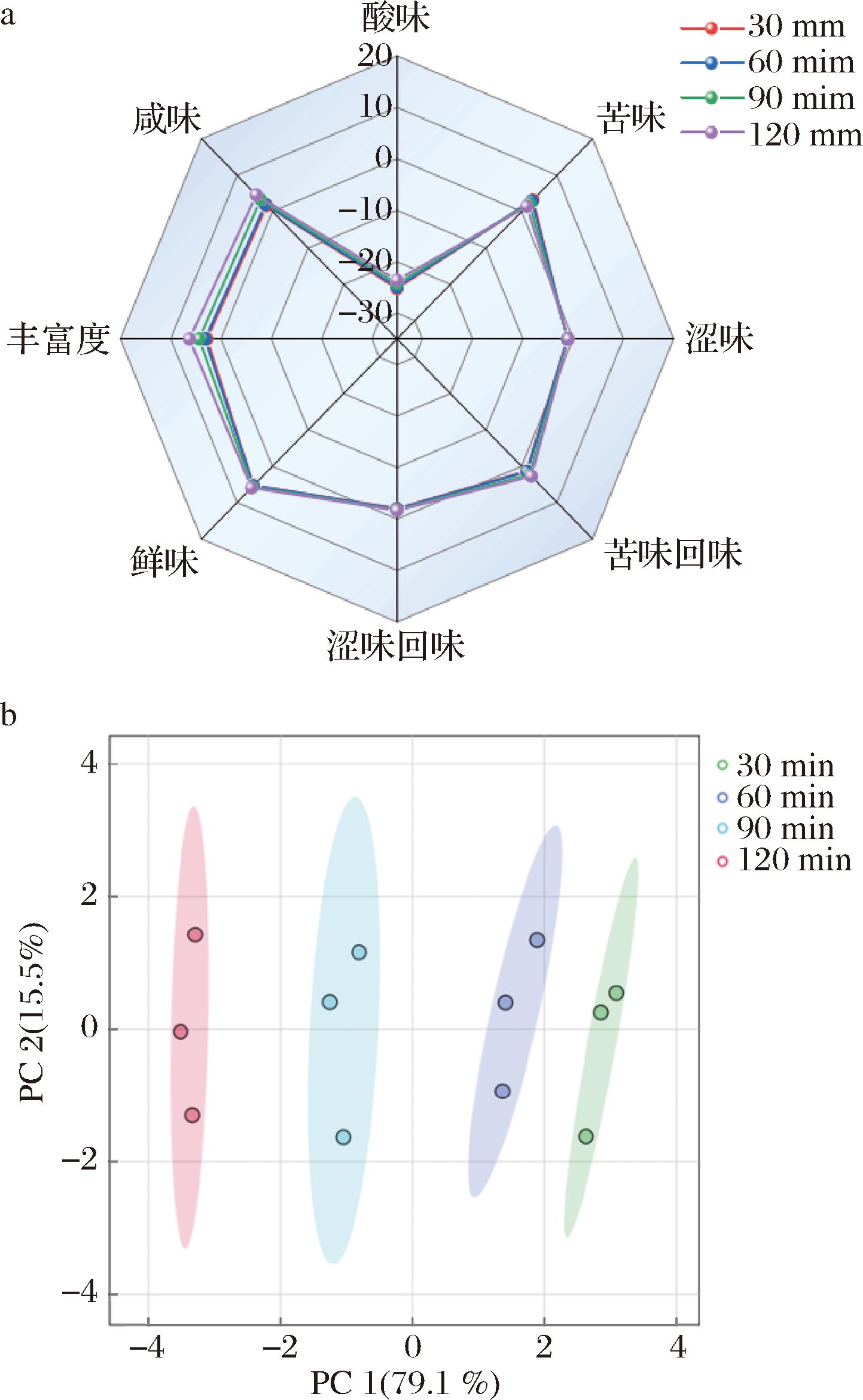 图6-a显示熬煮过程中鹅汤样品的电子舌雷达图。在滋味方面,4种鹅汤样品的电子舌传感器响应值均有所差异。在不同的熬煮时长条件下,鲜味、丰富度和咸味是鹅汤的主要味道特征。熬煮30~120 min的固始鹅汤的鲜味响应值不断提高,其中60~90 min时鹅汤的鲜味响应值较接近,鲜味主要源于鹅汤所含的蛋白质和氨基酸成分,咸味则主要归因于添加的食盐[22]。4组鹅汤样品的酸味值均在无味点以下,苦味值和涩味值接近。