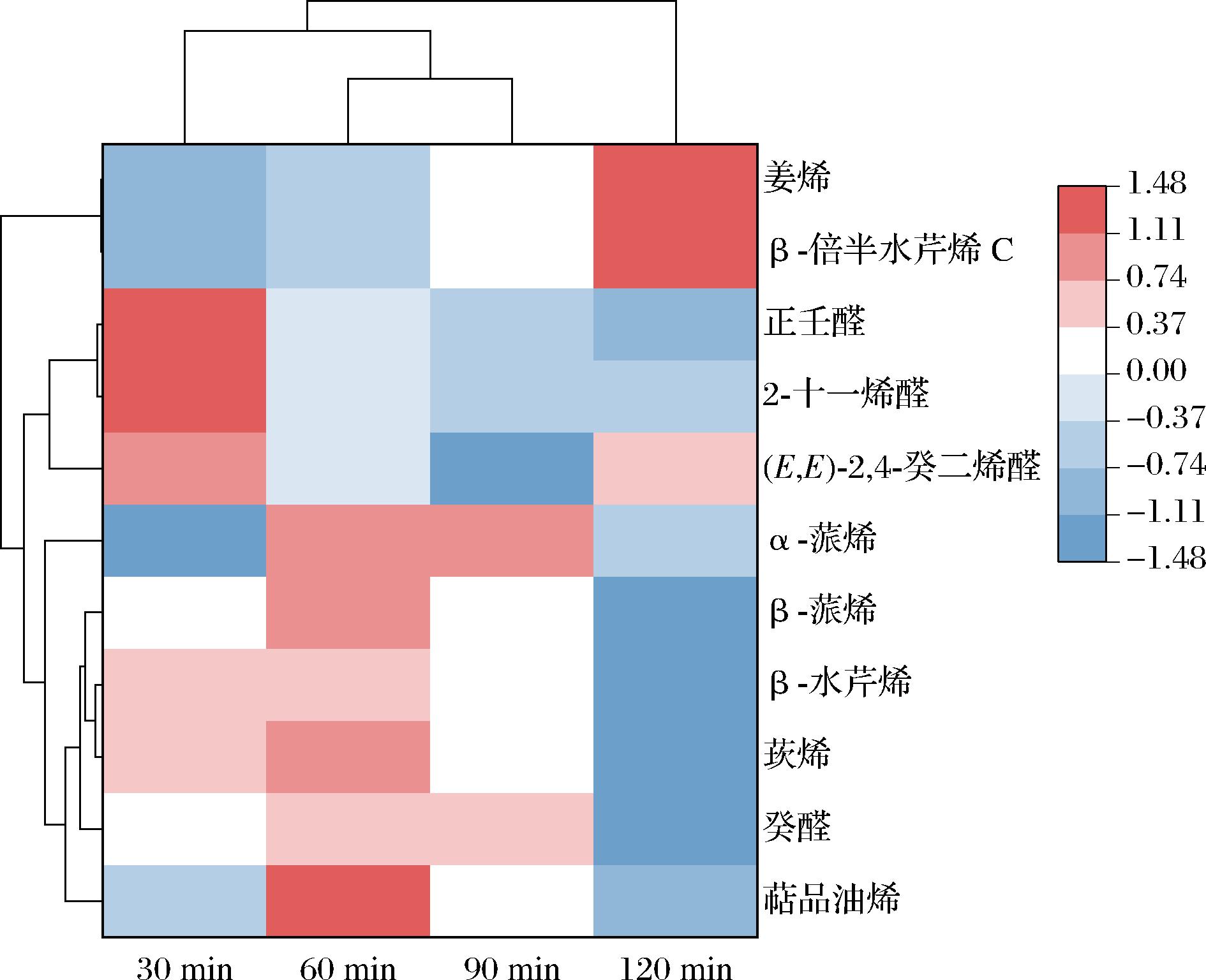 从聚类分析来看,固始鹅汤的风味差异主要集中在烯烃类和醛类化合物上。60与90 min组的样品聚在一起,说明60与90 min组的关键风味物质的组成种类与含量相近,具有相似的气味,与OPLS-DA分析结果一致。