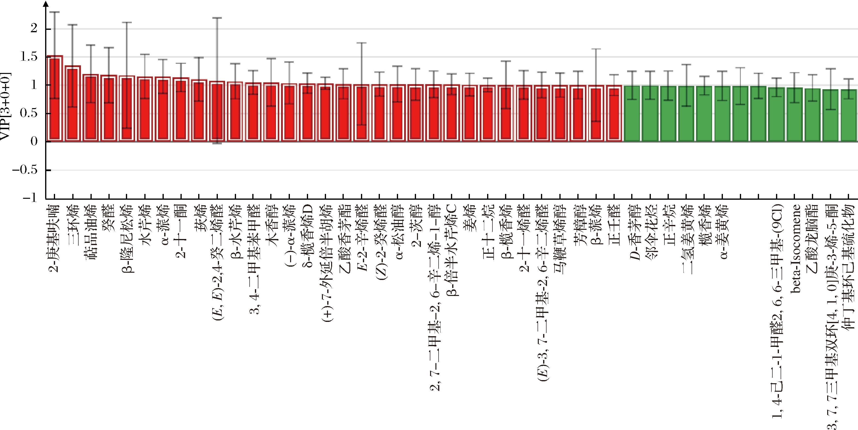 如图8所示,基于OPLS-DA构建的风味组学模型中,通过变量重要性投影(variable importance in projection,VIP)(VIP≥1.0)筛选出32种特征标志物,分别为2-庚基呋喃、三环烯、萜品油烯、癸醛、β-隆尼松烯、水芹烯、α-蒎烯、2-十一酮、莰烯、(E,E)-2,4-癸二烯醛、β-水芹烯、3,4-二甲基苯甲醛、木香醇、(-)-α-蒎烯、δ-榄香烯D、(+)-7-外延倍半胡烯、乙酸香茅酯、E-2-辛烯醛、(Z)-2-癸烯醛、α-松油醇、2-茨醇、2,7-二甲基-2,6-辛二烯-1-醇、β-倍半水芹烯C、姜烯、正十二烷、β-榄香烯、2-十一烯醛、(E)-3,7-二甲基-2,6-辛二烯醛、马鞭草烯醇、芳樟醇、β-蒎烯、正壬醛,共同构成固始鹅汤特征风味成分。