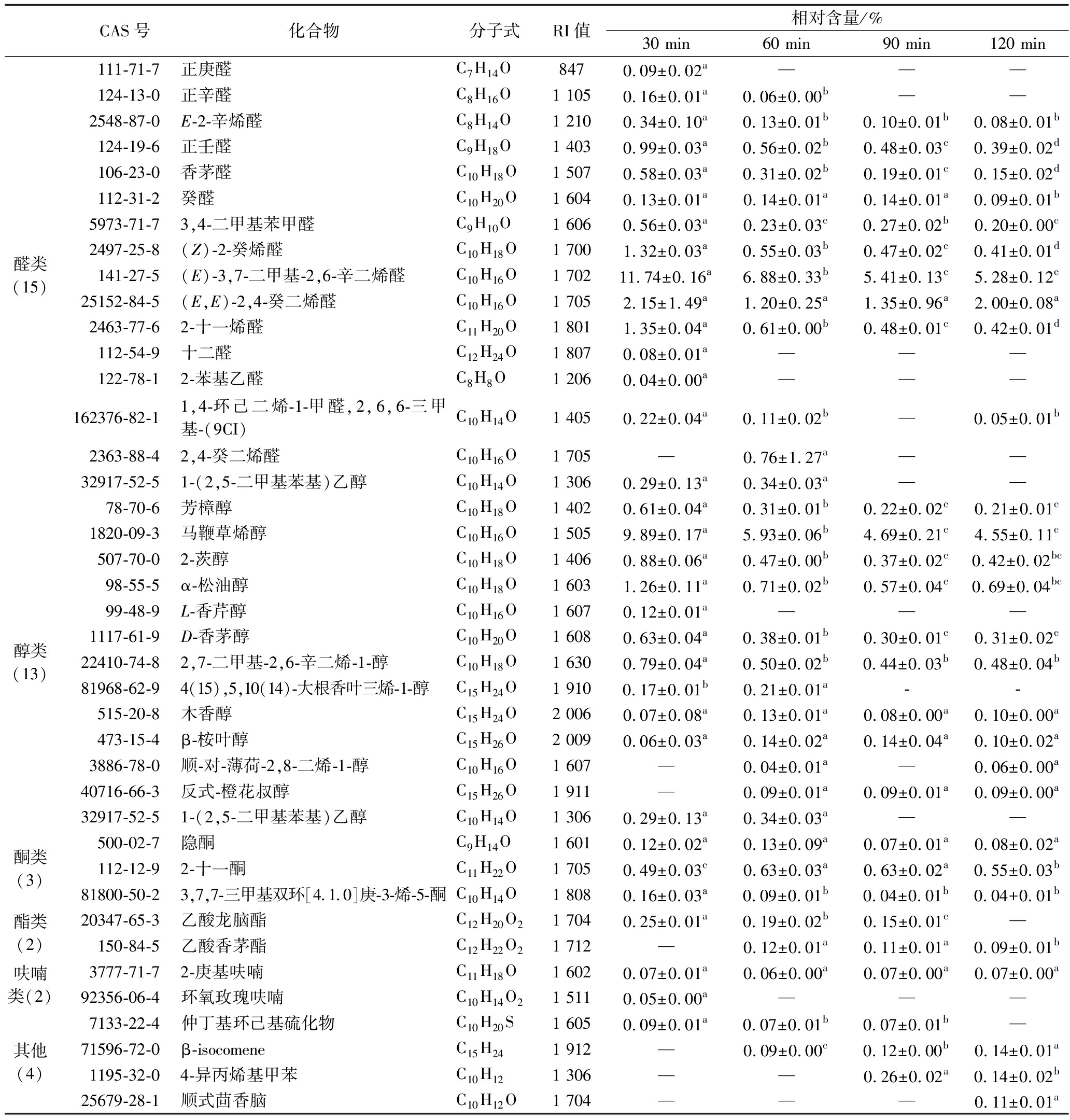 CAS号化合物分子式RI值相对含量/%30 min60 min90 min120 min醛类(15)111-71-7正庚醛C7H14O8470.09±0.02a———124-13-0正辛醛C8H16O1 1050.16±0.01a0.06±0.00b——2548-87-0E-2-辛烯醛C8H14O1 2100.34±0.10a0.13±0.01b0.10±0.01b0.08±0.01b124-19-6正壬醛C9H18O1 4030.99±0.03a0.56±0.02b0.48±0.03c0.39±0.02d106-23-0香茅醛C10H18O1 5070.58±0.03a0.31±0.02b0.19±0.01c0.15±0.02d112-31-2癸醛C10H20O1 6040.13±0.01a0.14±0.01a0.14±0.01a0.09±0.01b5973-71-73,4-二甲基苯甲醛C9H10O1 6060.56±0.03a0.23±0.03c0.27±0.02b0.20±0.00c2497-25-8(Z)-2-癸烯醛C10H18O1 7001.32±0.03a0.55±0.03b0.47±0.02c0.41±0.01d141-27-5(E)-3,7-二甲基-2,6-辛二烯醛C10H16O1 70211.74±0.16a6.88±0.33b5.41±0.13c5.28±0.12c25152-84-5(E,E)-2,4-癸二烯醛C10H16O1 7052.15±1.49a1.20±0.25a1.35±0.96a2.00±0.08a2463-77-62-十一烯醛C11H20O1 8011.35±0.04a0.61±0.00b0.48±0.01c0.42±0.01d112-54-9十二醛C12H24O1 8070.08±0.01a———122-78-12-苯基乙醛C8H8O1 2060.04±0.00a———162376-82-11,4-环己二烯-1-甲醛,2,6,6-三甲基-(9CI)C10H14O1 4050.22±0.04a0.11±0.02b—0.05±0.01b2363-88-42,4-癸二烯醛C10H16O1 705—0.76±1.27a——32917-52-51-(2,5-二甲基苯基)乙醇C10H14O1 3060.29±0.13a0.34±0.03a——醇类(13)78-70-6芳樟醇C10H18O1 4020.61±0.04a0.31±0.01b0.22±0.02c0.21±0.01c1820-09-3马鞭草烯醇C10H16O1 5059.89±0.17a5.93±0.06b4.69±0.21c4.55±0.11c507-70-02-茨醇C10H18O1 4060.88±0.06a0.47±0.00b0.37±0.02c0.42±0.02bc98-55-5α-松油醇C10H18O1 6031.26±0.11a0.71±0.02b0.57±0.04c0.69±0.04bc99-48-9L-香芹醇C10H16O1 6070.12±0.01a———1117-61-9D-香茅醇C10H20O1 6080.63±0.04a0.38±0.01b0.30±0.01c0.31±0.02c22410-74-82,7-二甲基-2,6-辛二烯-1-醇C10H18O1 6300.79±0.04a0.50±0.02b0.44±0.03b0.48±0.04b81968-62-94(15),5,10(14)-大根香叶三烯-1-醇C15H24O1 9100.17±0.01b0.21±0.01a--515-20-8木香醇C15H24O2 0060.07±0.08a0.13±0.01a0.08±0.00a0.10±0.00a473-15-4β-桉叶醇C15H26O2 0090.06±0.03a0.14±0.02a0.14±0.04a0.10±0.02a3886-78-0顺-对-薄荷-2,8-二烯-1-醇C10H16O1 607—0.04±0.01a—0.06±0.00a40716-66-3反式-橙花叔醇C15H26O1 911—0.09±0.01a0.09±0.01a0.09±0.00a32917-52-51-(2,5-二甲基苯基)乙醇C10H14O1 3060.29±0.13a0.34±0.03a——酮类(3)500-02-7隐酮C9H14O1 6010.12±0.02a0.13±0.09a0.07±0.01a0.08±0.02a112-12-92-十一酮C11H22O1 7050.49±0.03c0.63±0.03a0.63±0.02a0.55±0.03b81800-50-23,7,7-三甲基双环[4.1.0]庚-3-烯-5-酮C10H14O1 8080.16±0.03a0.09±0.01b0.04±0.01b0.04+0.01b酯类(2)20347-65-3乙酸龙脑酯C12H20O21 7040.25±0.01a0.19±0.02b0.15±0.01c—150-84-5乙酸香茅酯C12H22O21 712—0.12±0.01a0.11±0.01a0.09±0.01b呋喃类(2)3777-71-72-庚基呋喃C11H18O1 6020.07±0.01a0.06±0.00a0.07±0.00a0.07±0.00a92356-06-4环氧玫瑰呋喃C10H14O21 5110.05±0.00a———其他(4)7133-22-4仲丁基环己基硫化物C10H20S1 6050.09±0.01a0.07±0.01b0.07±0.01b—71596-72-0β-isocomeneC15H241 912—0.09±0.00c0.12±0.00b0.14±0.01a1195-32-04-异丙烯基甲苯C10H121 306——0.26±0.02a0.14±0.02b25679-28-1顺式茴香脑C10H12O1 704———0.11±0.01a