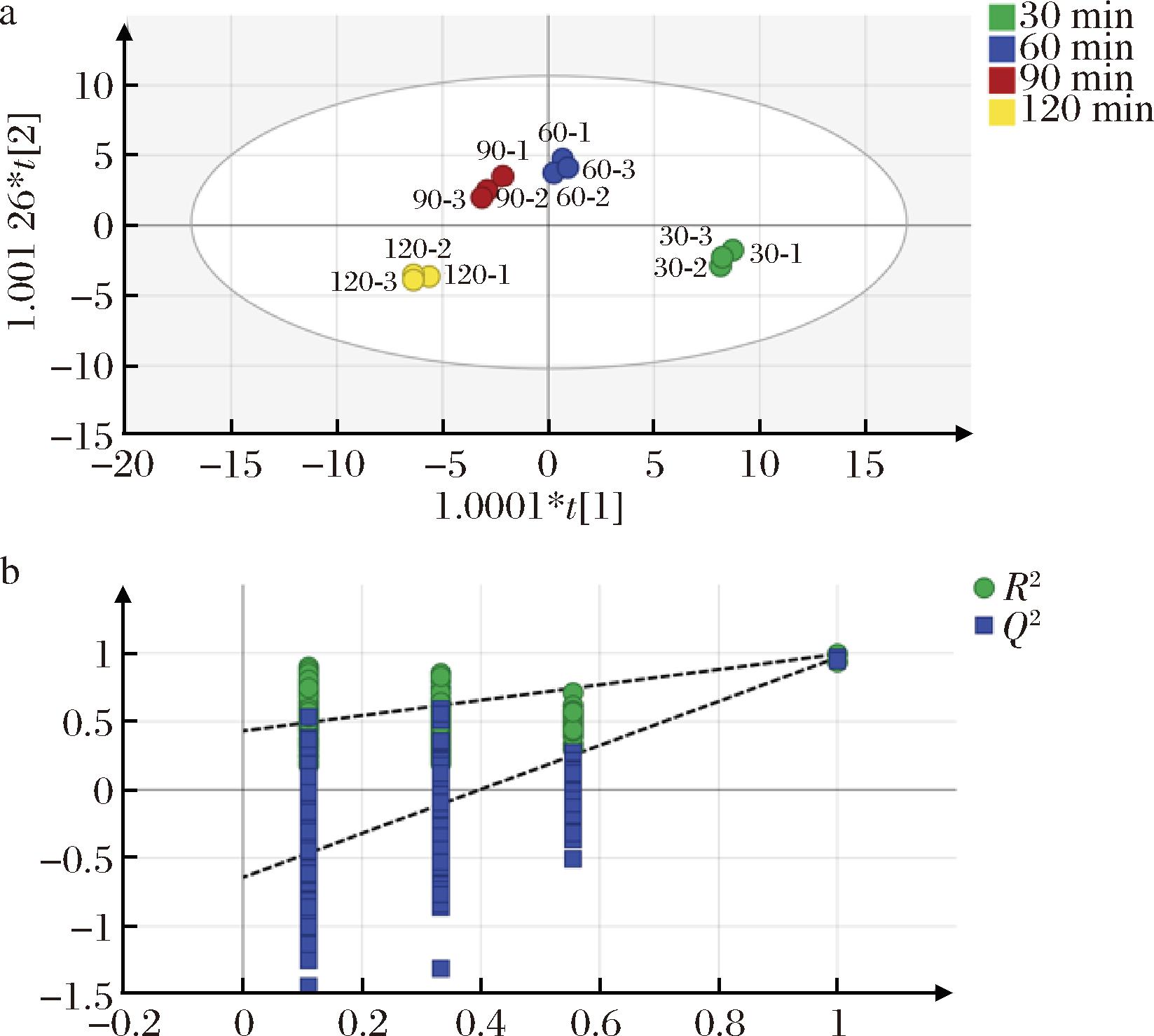 对检测所得化合物(因变量)与不同样品(自变量)进行OPLS-DA分析,结果如图7所示。模型参数显示,自变量拟合指数R2X=0.834,因变量拟合指数R2Y=0.87,模型预测指数Q2=0.593。模型中R2X-R2Y<0.3,且Q2位于0.5~1,判定该模型可靠性良好[34]。经200次交叉置换检验(R2=0.403,Q2=-0.714),Q2回归线与纵轴交点位于0点下方(图7-b),表明OPLS-DA判别模型有效,不存在过拟合[35]。如图7-a所示,熬煮过程中的样品分离良好,60 min位于第一和第二象限的X轴,90 min组位于第二象限,120、60 min组位于第三、四象限,表明4种样品的整体挥发性表征发生了显著变化。60 min与90 min组更接近,相关性较高。