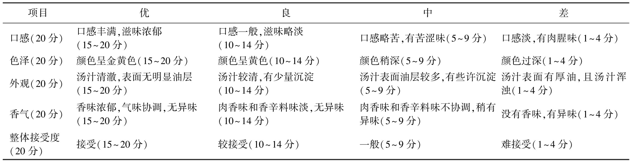 项目优良中差口感(20分)口感丰满,滋味浓郁(15~20分)口感一般,滋味略淡(10~14分)口感略苦,有苦涩味(5~9分)口感淡,有肉腥味(1~4分)色泽(20分)颜色呈金黄色(15~20分)颜色呈黄色(10~14分)颜色稍深(5~9分)颜色过深(1~4分)外观(20分)汤汁清澈,表面无明显油层(15~20分)汤汁较清,有少量沉淀(10~14分)汤汁表面油层较多,有些许沉淀(5~9分)汤汁表面有厚油,且汤汁浑浊(1~4分)香气(20分)香味浓郁,气味协调,无异味(15~20分)肉香味和香辛料味淡,无异味(10~14分)肉香味和香辛料味不协调,稍有异味(5~9分)没有香味,有异味(1~4分)整体接受度(20分)接受(15~20分)较接受(10~14分)一般(5~9分)难接受(1~4分)