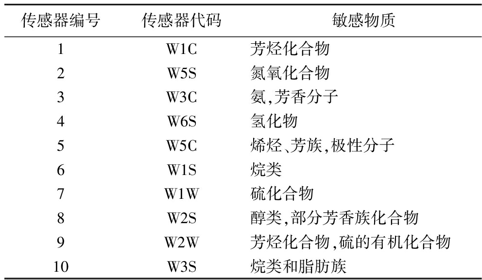 表2 电子鼻传感器名称和其响应物质