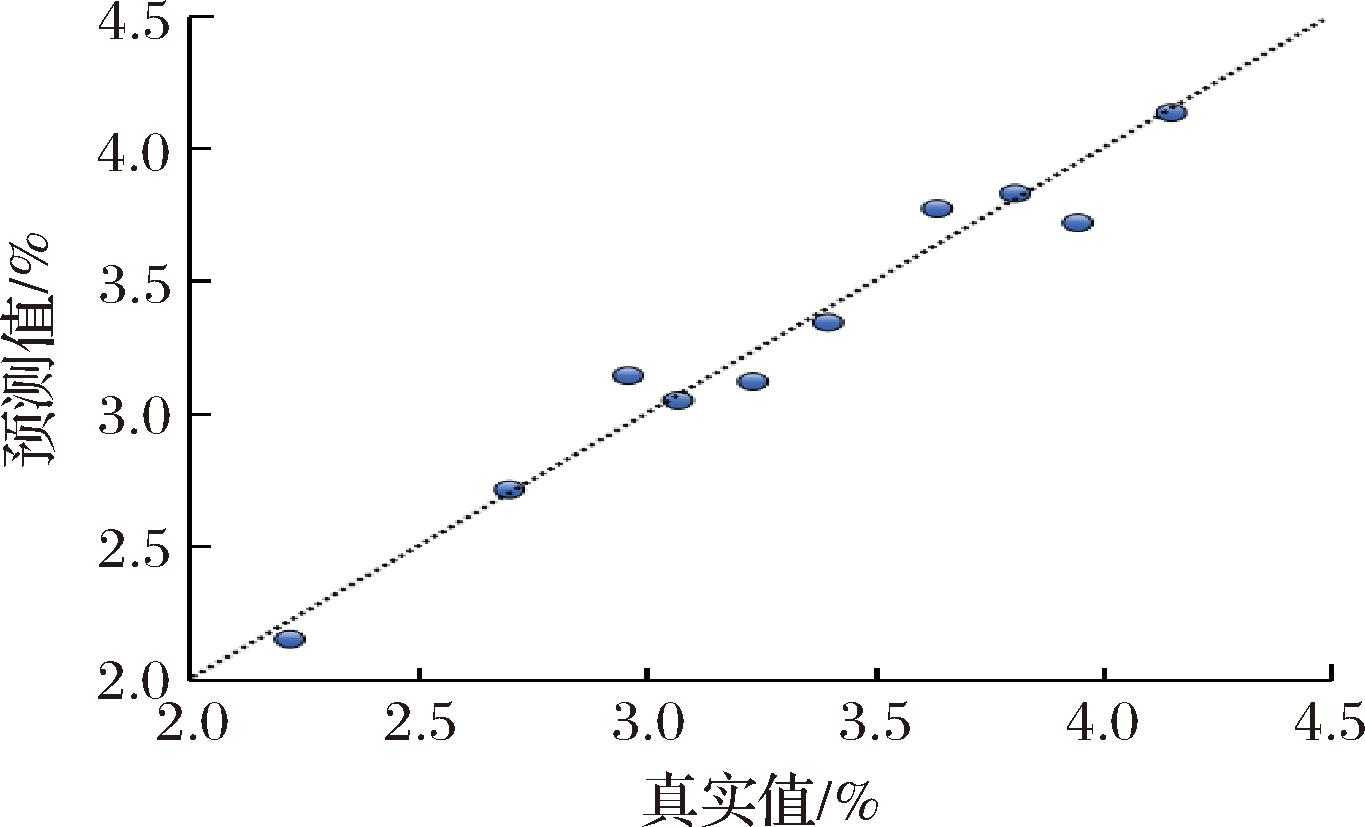 为进一步验证模型的准确性,将建模样本集外的完全外部验证集的10组数据分别输入到所建模型中,所得的预测结果如图5所示,样本多糖含量实测值与模型预测值间未出现显著系统性偏差,进一步表明所建立的近红外定量分析模型对刺糖中多糖含量预测,具有较高准确性。经验证,该模型满足定量分析要求,可实现科研与生产应用中刺糖多糖含量的快速检测。