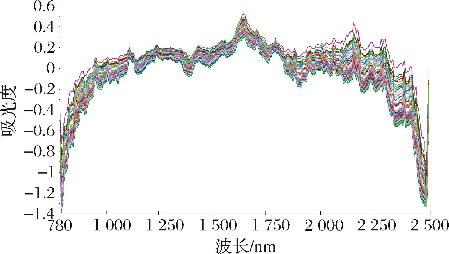 100批次刺糖样本近红外原始光谱如图1所示,原始光谱图趋势大致相同,但不同样本间吸光度存在一定的差异,说明各样本中成分含量有所不用,能够为刺糖中多糖含量的测定提供光谱信息基础。观察图谱发现,在1 100~1 300 nm、1 350~1 500 nm、1 600~1 800 nm、2 000~2 300 nm波段范围内,均具有比较明显的吸收峰,但光谱基线存在明显偏移,光谱峰值大量重叠,从光谱的波长范围、峰形和位置不能确定样本之间的差异。因此,需要通过数据预处理等方法来确定差异,从而提高预测模型的稳定及准确性。