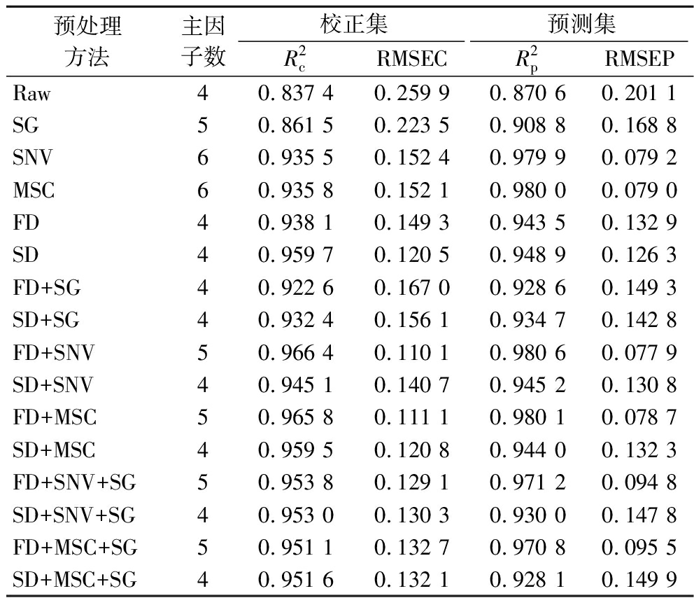预处理方法主因子数校正集预测集R2cRMSECR2pRMSEPRaw4 0.837 4 0.259 9 0.870 6 0.201 1 SG5 0.861 5 0.223 5 0.908 8 0.168 8 SNV6 0.935 5 0.152 4 0.979 9 0.079 2 MSC6 0.935 8 0.152 1 0.980 0 0.079 0 FD4 0.938 1 0.149 3 0.943 5 0.132 9 SD4 0.959 7 0.120 5 0.948 9 0.126 3 FD+SG4 0.922 6 0.167 0 0.928 6 0.149 3 SD+SG4 0.932 4 0.156 1 0.934 7 0.142 8 FD+SNV5 0.966 4 0.110 1 0.980 6 0.077 9 SD+SNV4 0.945 1 0.140 7 0.945 2 0.130 8 FD+MSC5 0.965 8 0.111 1 0.980 1 0.078 7 SD+MSC4 0.959 5 0.120 8 0.944 0 0.132 3 FD+SNV+SG5 0.953 8 0.129 1 0.971 2 0.094 8 SD+SNV+SG4 0.953 0 0.130 3 0.930 0 0.147 8 FD+MSC+SG5 0.951 1 0.132 7 0.970 8 0.095 5 SD+MSC+SG4 0.951 6 0.132 1 0.928 1 0.149 9