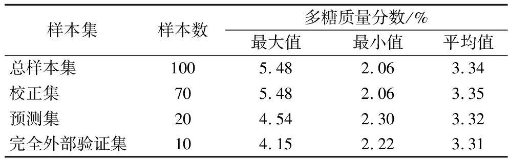 样本集样本数多糖质量分数/%最大值最小值平均值总样本集1005.48 2.06 3.34 校正集705.48 2.06 3.35 预测集204.54 2.30 3.32 完全外部验证集104.15 2.22 3.31