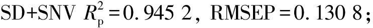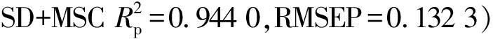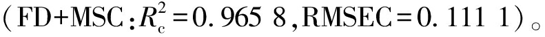 上远超其他方法,其R2值较高且比较接近,主因子数均为5。而FD+SNV与FD+MSC之间,FD+SNV的预测误差(RMSEP=0.077 9)略低于FD+MSC(RMSEP=0.078 7),同时其校正集性能