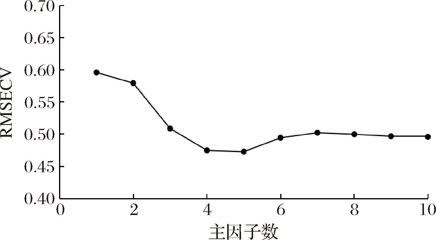 在PLS建模时,对主因子数进行系统考察也是模型构建的核心环节。主因子数不足将导致模型无法充分提取数据中的有效协变结构,造成拟合不足,进而削弱模型的预测性能;反之,主成分数量过多则易引入噪声,引发过拟合,使模型在训练集上表现良好而在独立样本上的预测能力严重劣化[26]。因此,需通过交叉验证方法,以最小化交叉验证均方根误差(root mean square error of cross validation,RMSECV)为评价指标,精准识别预测误差下降趋于平缓的拐点区域,结果见图3,当主因子数为5时,RMSECV值最小为0.472 7。此时,