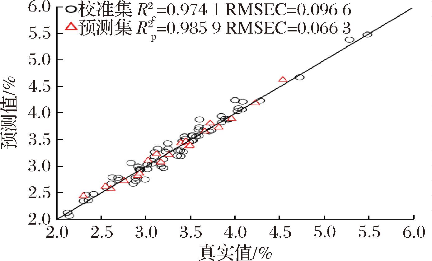 为0.985 9,RMSEC为0.096 6,RMSEP为0.066 3。图4直观呈现了刺糖中多糖含量的实际测量值与模型预测值之间的相关性。由图4可知,校正集与预测集的数据较为均匀的分布在拟合直线的两侧,且未出现显著偏移离群点。上述分布特征表明,所建近红外定量模型对刺糖多糖含量具有优异的预测精度与可靠性。综上所述,经过FD+SNV预处理的光谱数据结合PLS算法,可实现刺糖中多糖含量的快速准确定量分析。