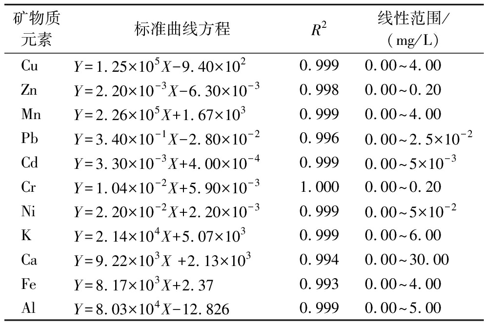矿物质元素标准曲线方程R2线性范围/(mg/L)CuY=1.25×105X-9.40×1020.9990.00~4.00 ZnY=2.20×10-3X-6.30×10-30.9980.00~0.20MnY=2.26×105X+1.67×1030.9990.00~4.00PbY=3.40×10-1X-2.80×10-20.9960.00~2.5×10-2CdY=3.30×10-3X+4.00×10-40.9990.00~5×10-3CrY=1.04×10-2X+5.90×10-31.0000.00~0.20NiY=2.20×10-2X+2.20×10-30.9990.00~5×10-2KY=2.14×104X+5.07×1030.9990.00~6.00CaY=9.22×103X +2.13×1030.9940.00~30.00FeY=8.17×103X+2.370.9930.00~4.00AlY=8.03×104X-12.8260.9990.00~5.00