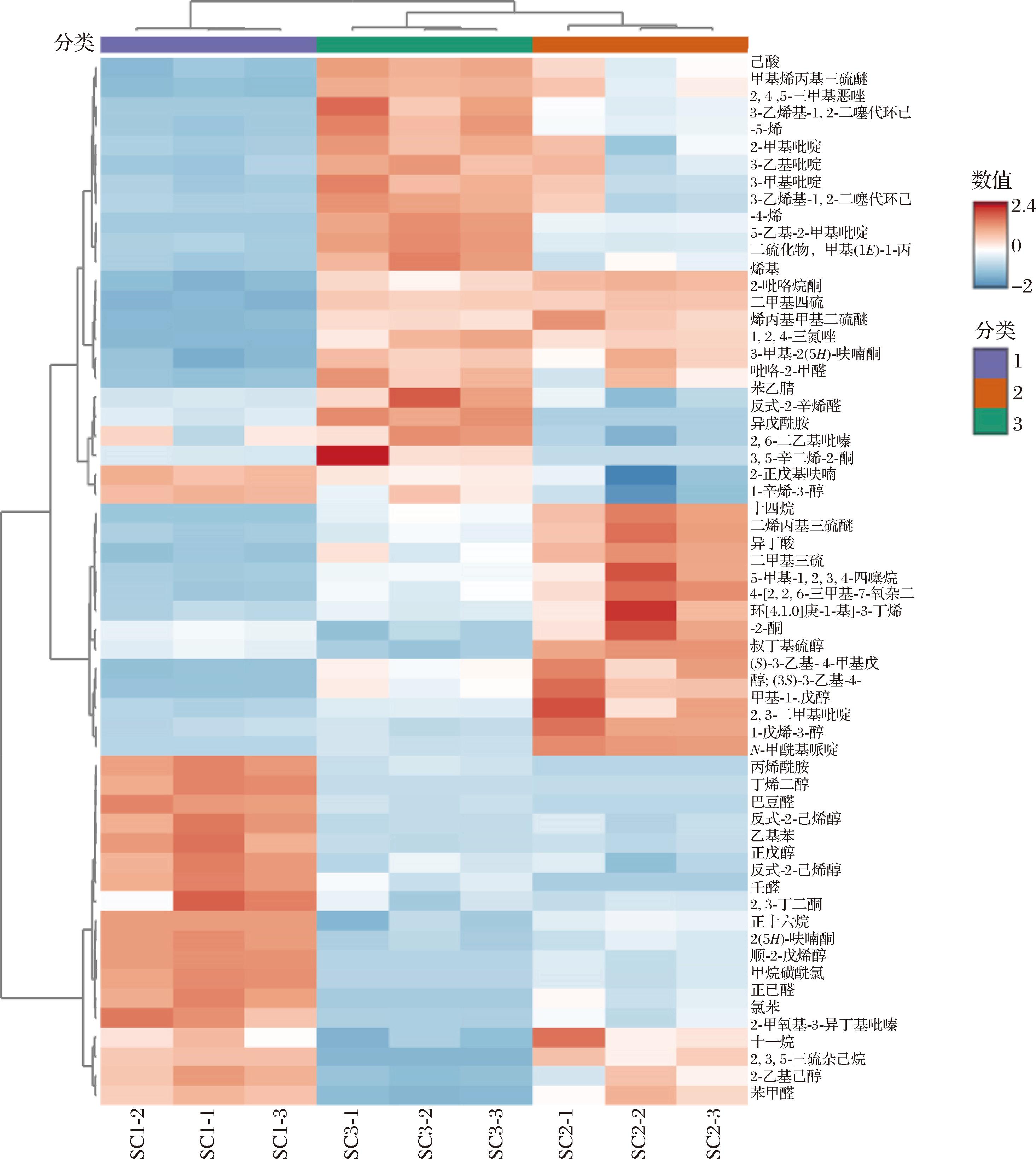 在第3组中,发现有23个关键的差异化合物在SC3更为丰富,SC3中酮类风味物质与SC1有显著性差异,如3,5-辛二烯-2-酮会赋予植物独特的坚果风味及辛辣味,因此SC3的辣味气味更为浓厚。