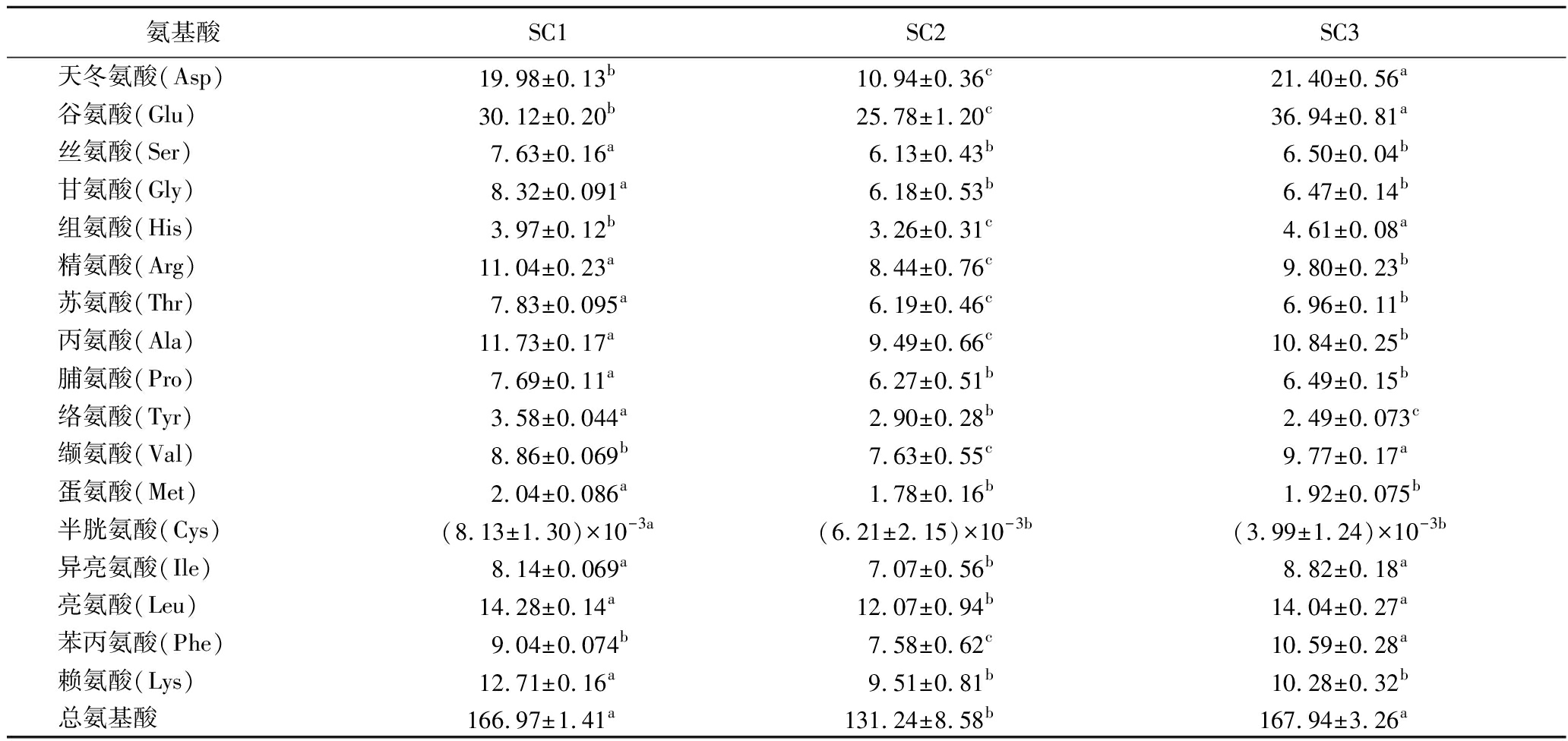 3个产地沙葱的氨基酸色谱图见图3,氨基酸组成及含量结果见表3。3个产地总氨基酸含量为131.24~167.94 mg/g,必需氨基酸含量为39.89%~42.47%。就总氨基酸含量而言,SC1和SC3产地接近,且显著高于SC2产地。就单个氨基酸而言,沙葱含有丰富的天冬氨酸、谷氨酸、精氨酸、丙氨酸、亮氨酸和赖氨酸,含有少量的组氨酸、酪氨酸、蛋氨酸和半胱氨酸,且在不同产地中的含量存在差异。