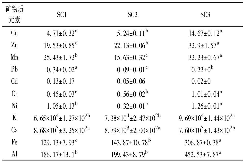 矿物质元素SC1SC2SC3Cu4.71±0.32c5.24±0.11b14.67±0.12aZn19.53±0.85c22.13±0.06b32.9±1.57aMn25.43±1.72b15.63±0.32c32.23±0.67aPb0.34±0.02a0.09±0.01c0.22±0bCd0.13±0.170.05±0.060.02±0Cr0.45±0.03c0.56±0.02b1.01±0.04aNi1.05±0.13b0.32±0.01c1.26±0.01aK6.65×104±1.27×102b7.38×104±2.47×102b 9.69×104±1.44×102aCa8.68×103±3.25×102a8.79×103±2.00×102a7.60×103±1.43×102bFe129.13±7.93c 143.87±10.78b 306.87±0.38a Al186.17±13.1b199.43±8.79b452.53±7.87a