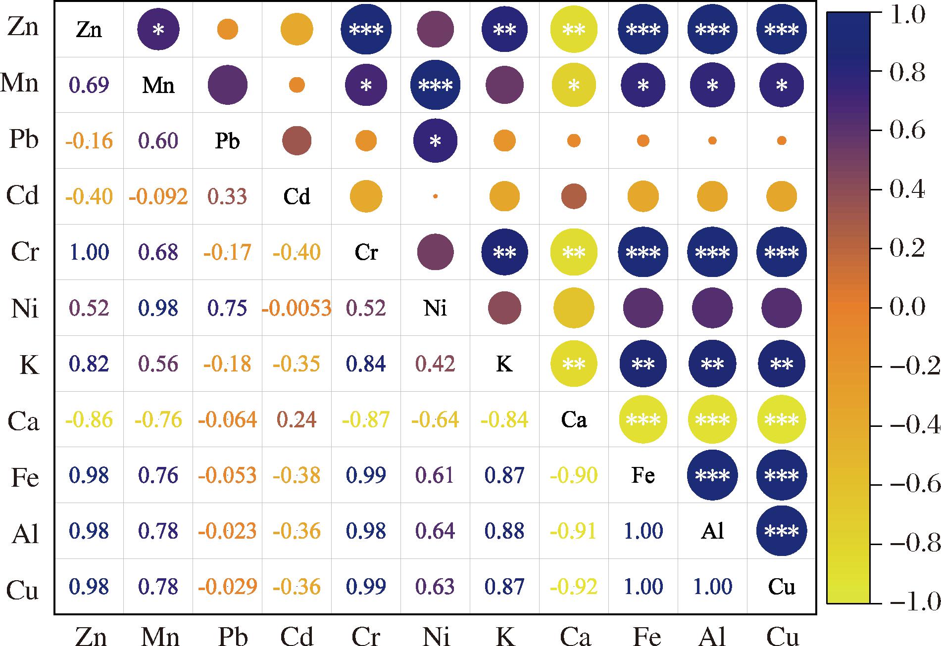 对不同矿物质元素之间的相关性进行了分析,结果见图2。Mn、Zn、Cu、Al、Fe、Cr、K之间具有显著的正相关性(除Mn与K);Pb只与Ni呈显著的正相关性;Cd与其他元素之间均无显著的相关性;Ca与Cu、Al、Fe、Cr、K、Mn、Zn之间呈显著的负相关性。表明沙葱在生长过程中,不同矿物质元素之间的吸收与代谢存在协同或拮抗的关系。西北地区土壤多呈碱性[18],在盐碱土或干旱区,植物优先吸收Ca2+以维持渗透调节和膜稳定性,但会抑制Fe、Al、Cu等的吸收,从而导致Ca与大部分元素呈现负相关性。