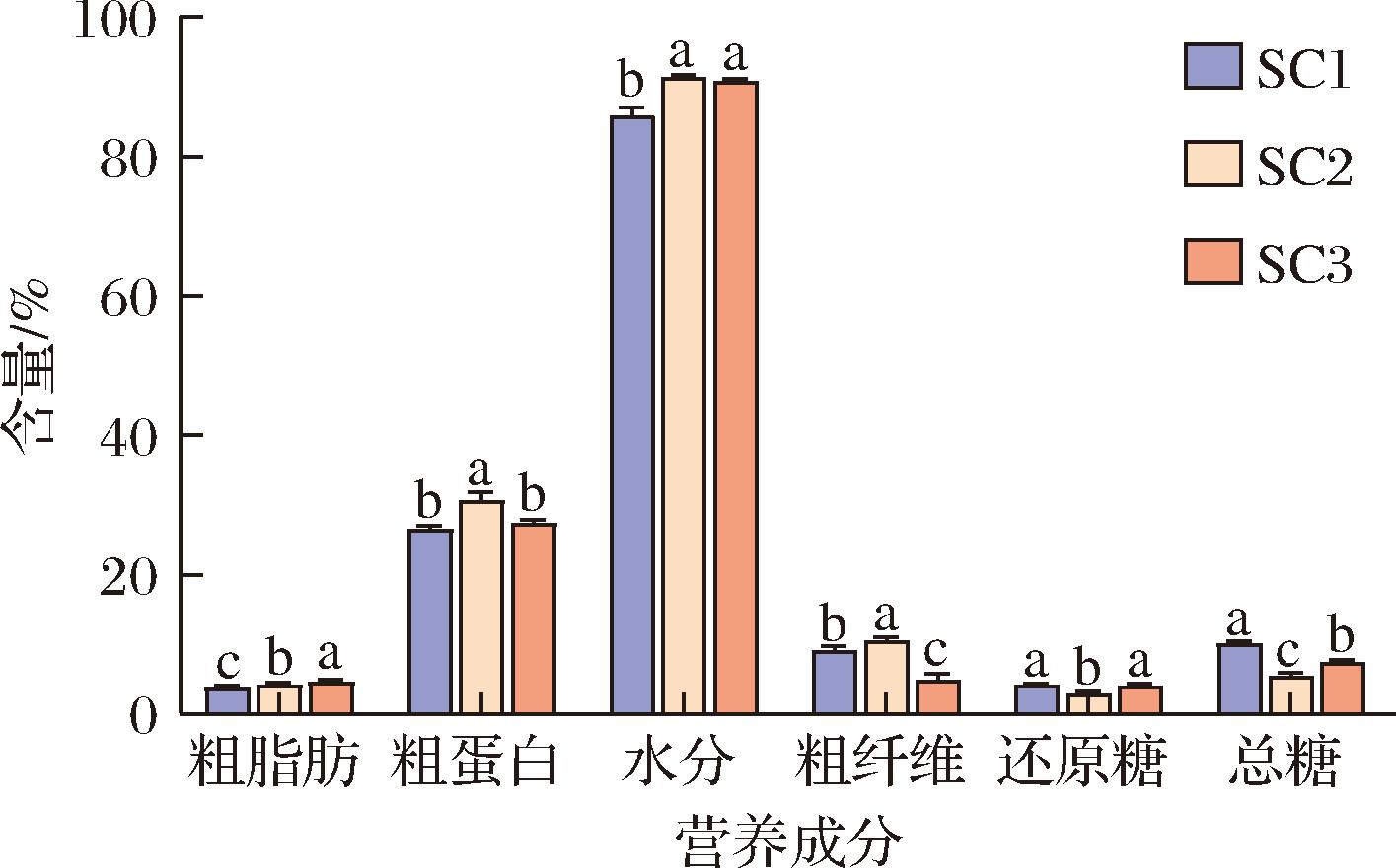 不同产地沙葱的粗脂肪、粗蛋白、水分、粗纤维、还原糖和总糖的测定结果见图1。3个产地沙葱的粗脂肪、粗蛋白、水分、粗纤维、还原糖及总糖的含量分别为3.90%~4.90%、26.60%~31.80%、85.17%~91.69%、4.30%~11.00%、2.97%~4.42%、5.35%~10.47%。不同产地沙葱其基本营养成分存在差异。粗脂肪含量呈现SC3>SC2>SC1(P<0.05)的趋势;粗蛋白含量呈现SC2>SC3>SC1的趋势,且SC2产地含量显著高于其他两地;水分含量呈现SC2>SC3>SC1的趋势,且SC1产地含量显著低于其他两地;粗纤维含量呈现SC2>SC1>SC3的趋势(P<0.05);还原糖和总糖含量均呈现SC1>SC3>SC2的趋势,且3个产地总糖含量差异具有统计学意义,SC2产地还原糖含量与其他两地差异具有统计学意义。