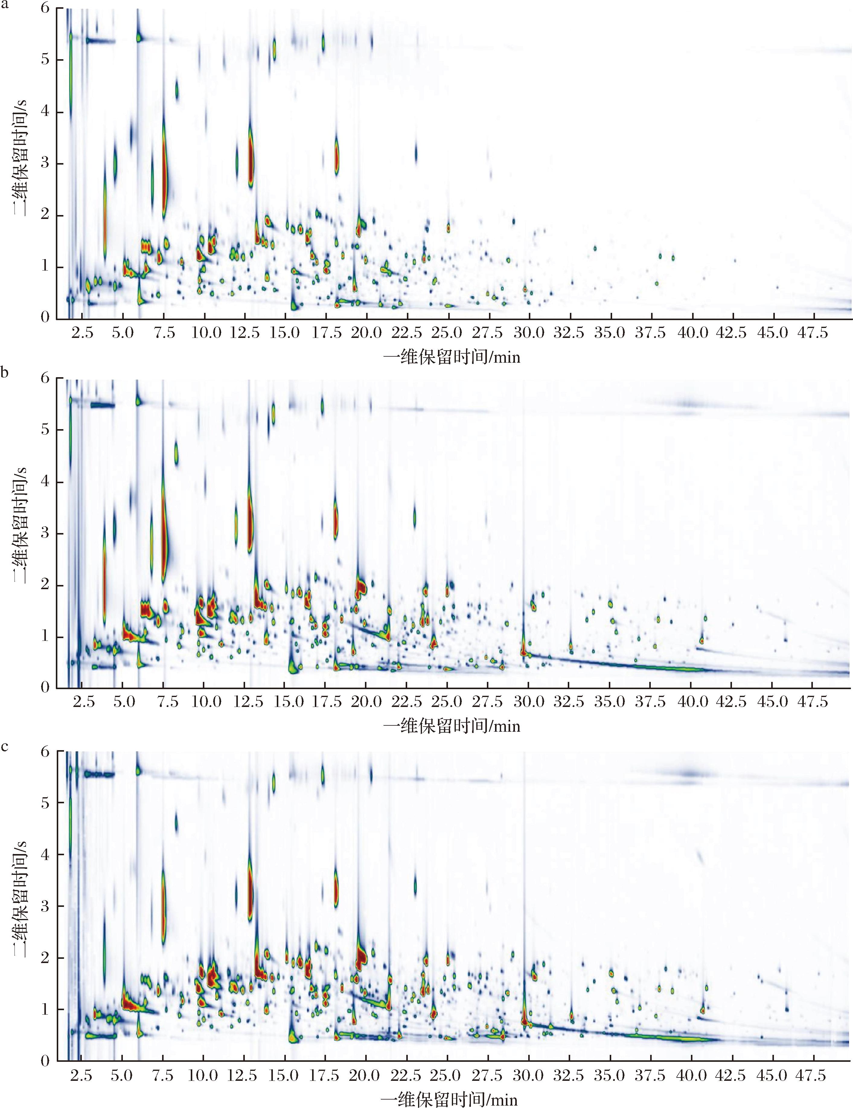 获得的质谱数据经Canvas数据处理软件自动进行峰检测和合并,积分信噪比为10。去除柱流失等无效峰并手动合并个别拖尾峰后,根据NIST20谱库进行匹配(正向匹配度最高的化合物为准),且使用RI值对匹配结果稍加约束,对化合物进行定性。以化合物相对百分含量进行定量。