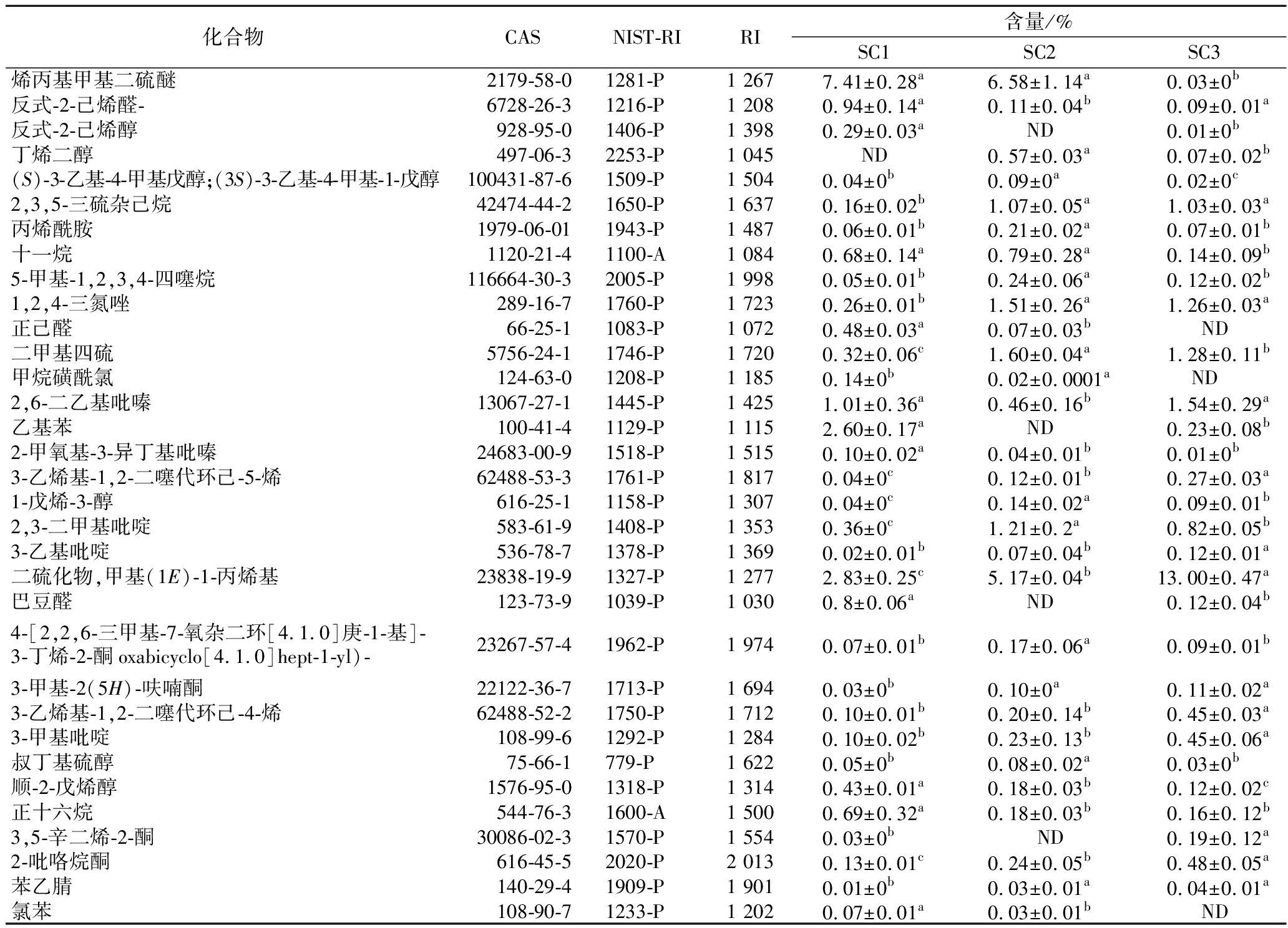 化合物CASNIST-RIRI含量/%SC1SC2SC35-乙基-2-甲基吡啶104-90-51408-P1 405ND0.06±0b0.17±0.01a正戊醇71-41-01250-P1 2460.83±0.07a0.34±0.06b0.32±0.01b吡咯-2-甲醛1003-29-82030-P1 9970.06±0.01b0.15±0.02a0.16±0.01a苯甲醛100-52-71520-P1 5042.42±0.11b2.23±0.32a1.01±0.03a壬醛124-19-61391-P1 3853.04±0.25a1.31±0.35b1.55±0.24b异戊酰胺541-46-81880-P1 9050.02±0b ND0.07±0.01a2,4,5-三甲基恶唑-20662-84-41199-P1 190ND0.05±0.01b0.13±0.03a1-辛烯-3-醇3391-86-41450-P1 4440.22±0a0.12±0.03b0.19±0.03a2(5H)-呋喃酮497-23-41743-P1 7270.12±0a0.07±0b0.04±0.01c2-甲基吡啶109-06-81220-P1 2120.16±0.01b0.32±0.18b0.54±0.05aN-甲酰基哌啶2591-86-81762-P1 7530.09±0b0.17±0.03a0.11±0b异丁酸79-31-21570-P1 5570.24±0.01c0.49±0.03a0.36±0.05b反式-2-辛烯醛2548-87-01429-P1 4180.02±0b0.02±0.01b0.04±0.01a2-乙基己醇104-76-71491-P1 4840.27±0.02a0.21±0.05b0.10±0c二甲基三硫3658-80-81377-P1 3637.86±0.09b16.11±3.5a11.12±0.1b甲基烯丙基三硫醚34135-85-81593-P1 5715.44±0.15c11.15±2.1b14.28±0.22a2-正戊基呋喃3777-69-31232-P1 2230.07±0a0.04±0.01b0.06±0a二烯丙基三硫醚2050-87-51806-P1 7681.22±0.03c2.23±0.23a1.54±0.08b十四烷629-59-41400-A1 400ND1.63±0.25a0.75±0.11b己酸142-62-11846-P1 8350.16±0.01c0.30±0.05b0.42±0.01a2,3-丁二酮431-03-8979-P9600.20±0.02a ND0.06±0.02b