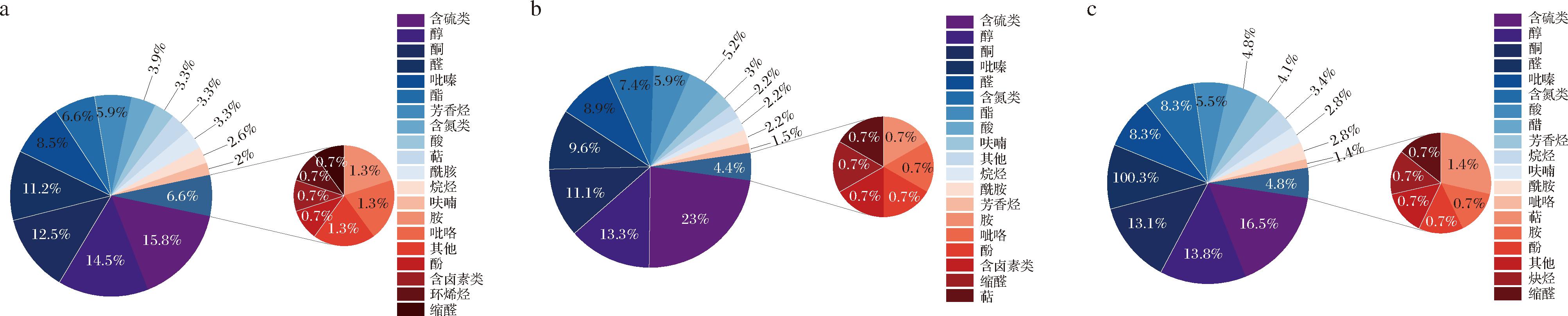采用GC×GC-TOF-MS技术分析了3个产地沙葱的风味物质,总离子流图见图4。3个产地的沙葱中共鉴定出368种风味化合物,包括54种醇类化合物,50种含硫化合物,42种酮,37种醛,31种吡嗪,30种酯,25种含氮类化合物,24种芳香烃,13种酸,11种烷烃,10种萜,8种酰胺,7种呋喃,6种其他类化合物,4种胺,3种吡咯,3种含卤素类化合物,2种醚,1种酚,1种环烷烃,1种环烯烃,1种炔烃,1种缩醛,1种烯烃。其中SC1、SC2、SC3分别检测出152、135、145种化合物。