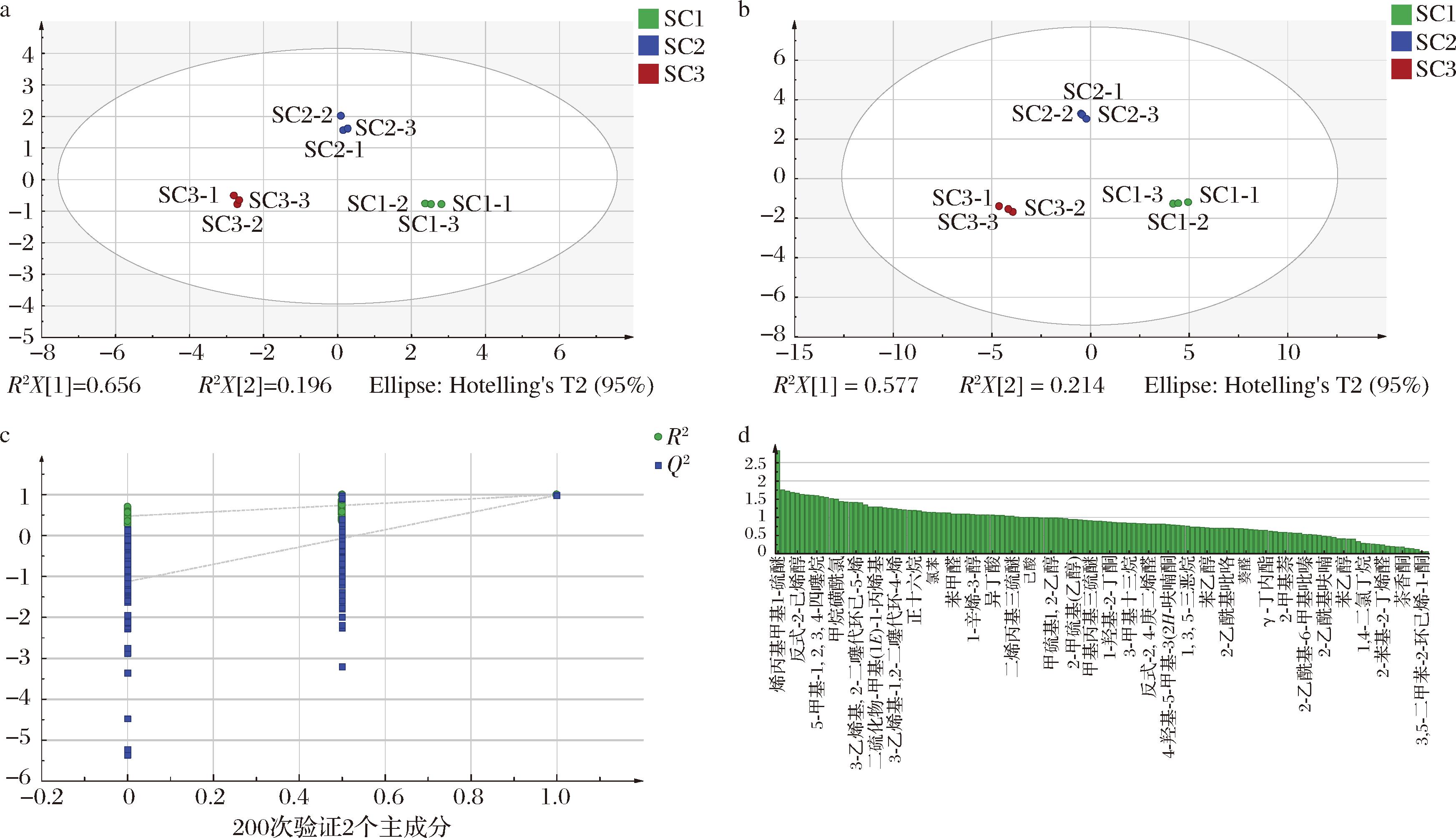 a-不同产地沙葱风味物质主成分分析图;b-OPLS-DA模型图;c-交叉验证结果;d-VIP预测值结果