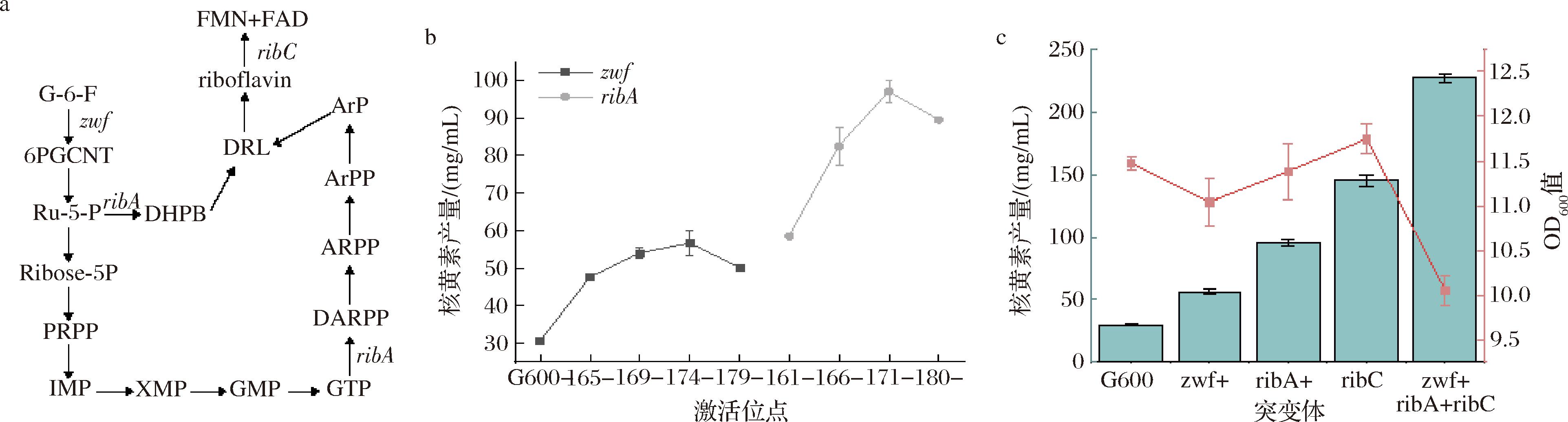 a-核黄素代谢示意图;b-不同激活位点激活分别激活2种基因时对核黄素产量的影响;c-核黄素摇瓶发酵产量