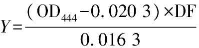 式中:R2=0.999 7;OD444,444 nm处的吸光度值;Y,核黄素质量浓度(mg/L);DF,稀释倍数;OD444通过稀释控制在0.1~0.8。