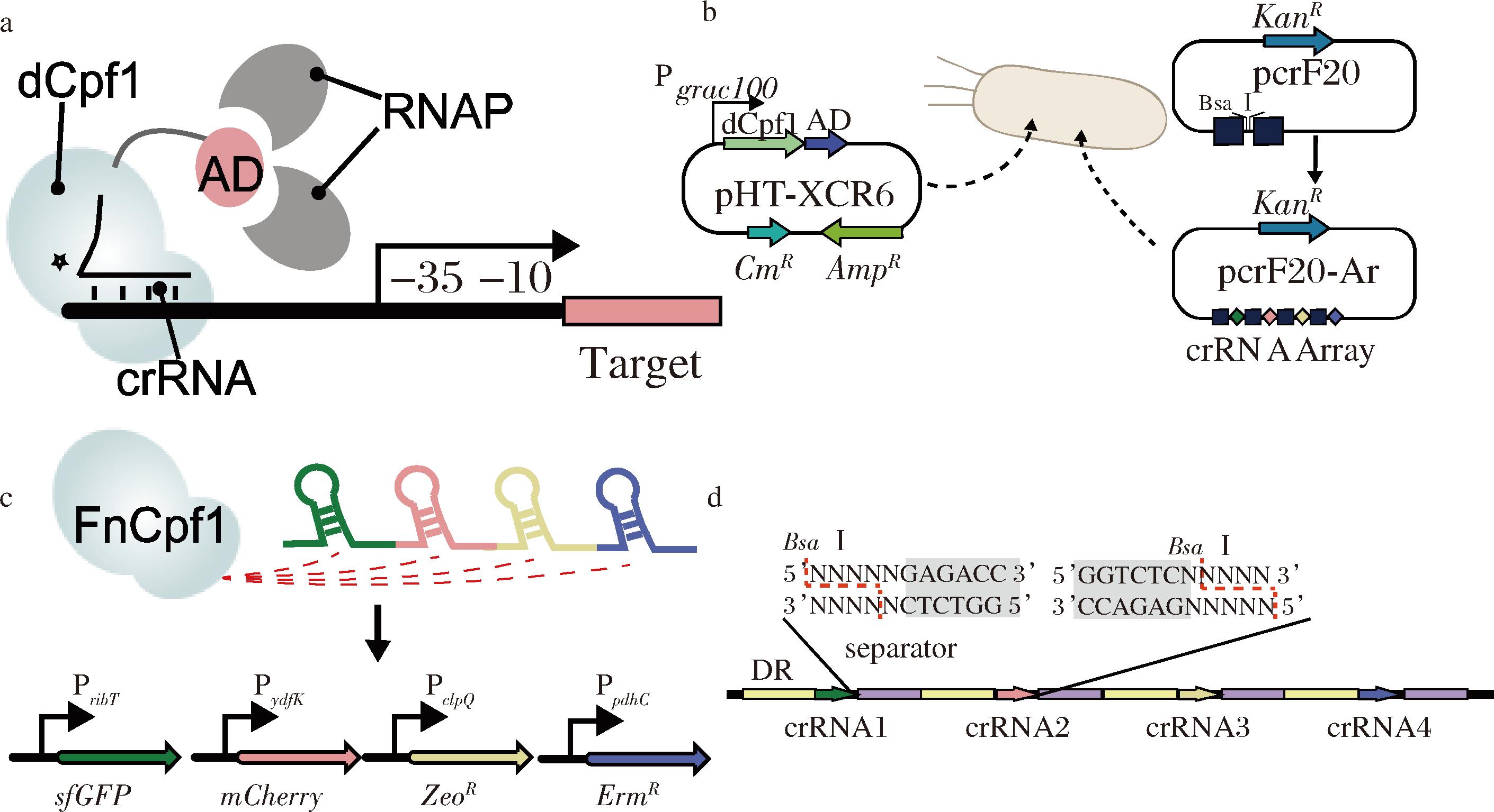 注:dCpf1:dead Cpf1 失活Cpf1蛋白;Target:靶基因;CmR:氯霉素抗性基因;AmpR:氨苄青霉素抗性基因;Pgrac100:高效启动子;KanR:卡那霉素抗性基因;crRNA array: 向导RNA阵列;ZeoR:博来霉素抗性基因;ErmR:红霉素抗性基因。