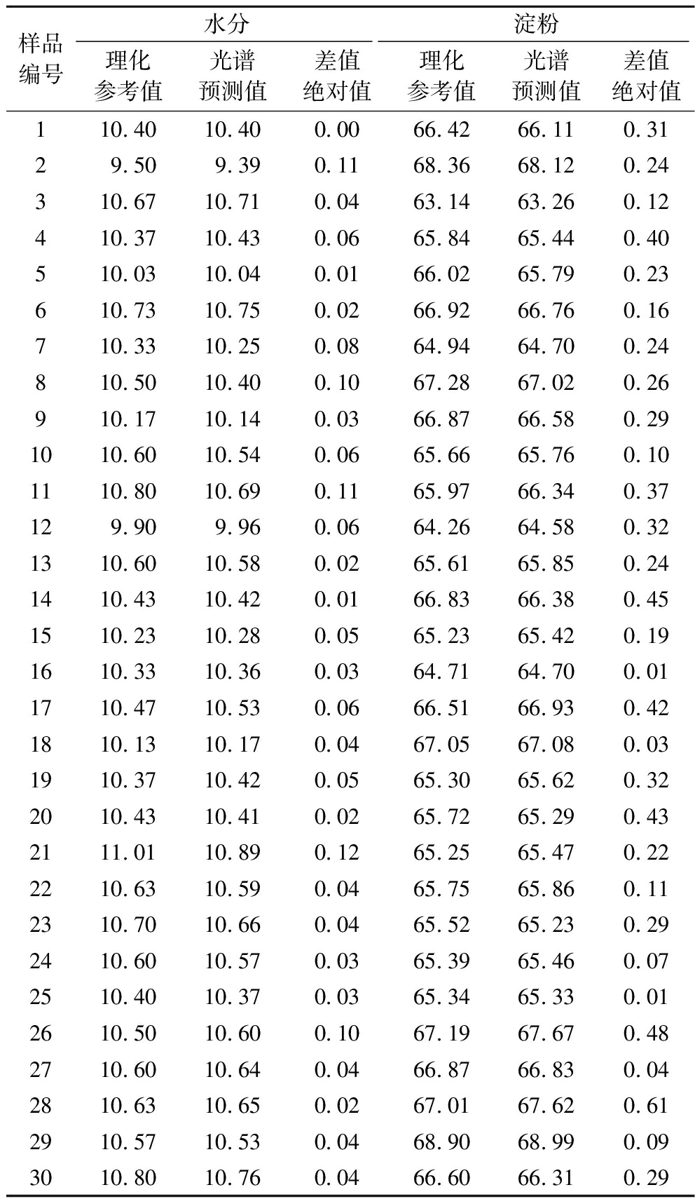 随机取30份高粱样品作为盲样进行外部验证,利用理化常规方法和所建模型分别对其进行检测分析,得出高粱水分、淀粉含量的参考值和预测值如表4所示,通过比较发现,所选高粱盲样水分、淀粉指标模型的预测值和参考值的绝对误差均较小,水分的绝对误差范围为0~0.12、淀粉为0.01~0.61,说明模型预测能力良好,具有较高的准确性和可靠性。