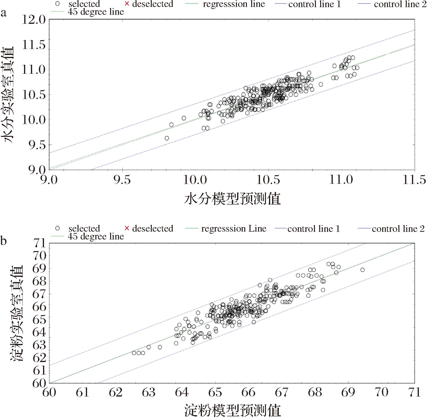 利用WinISI软件,采用PCA将光谱数据转化为主成分数据,并与化学分析数据相结合进行定标建模,采用改进偏最小二乘法(modified PLS)对得分文件建模,采用一阶导数结合Detrend的数学处理方法[23],并结合SNV进行光学校正消除固体颗粒大小、表面散射以及光程变化对光谱的影响[24]。最终建立起高粱水分、淀粉含量快速无损测定的近红外预测模型,所建模型对高粱样品水分、淀粉含量的预测值与化学值的相关图见图6,可知预测值与化学值的相关性强,表明模型预测效果良好。其中,水分模型和淀粉模型的相关系数RSQ分别为0.857 9、0.831 9,交叉验证集的相关系数1-VR分别为0.812 0、0.793 4,说明模型的线性关系较好;同时,水分、淀粉模型的SEC分别为0.109 6、0.469 7,SECV分别为0.113 7、0.592 6 同时,模型内部参数值较小且相近,说明模型的质量较好。