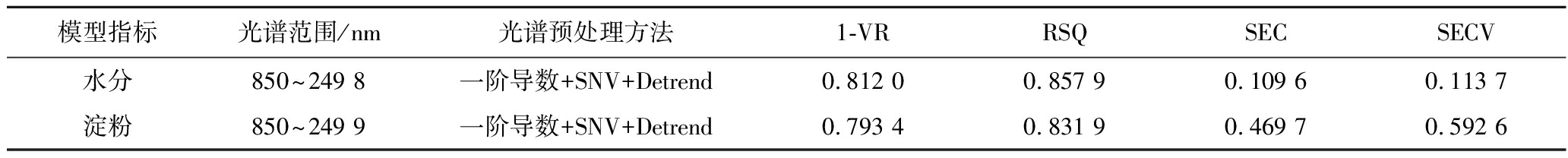 模型指标光谱范围/nm光谱预处理方法1-VRRSQSECSECV水分850~249 8一阶导数+SNV+Detrend0.812 0 0.857 9 0.109 6 0.113 7淀粉850~249 9一阶导数+SNV+Detrend0.793 4 0.831 9 0.469 7 0.592 6