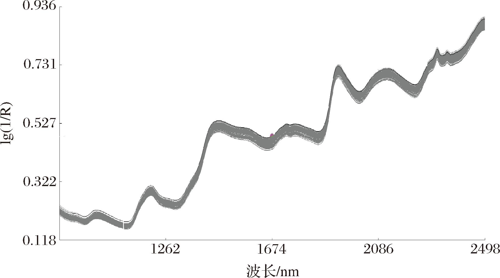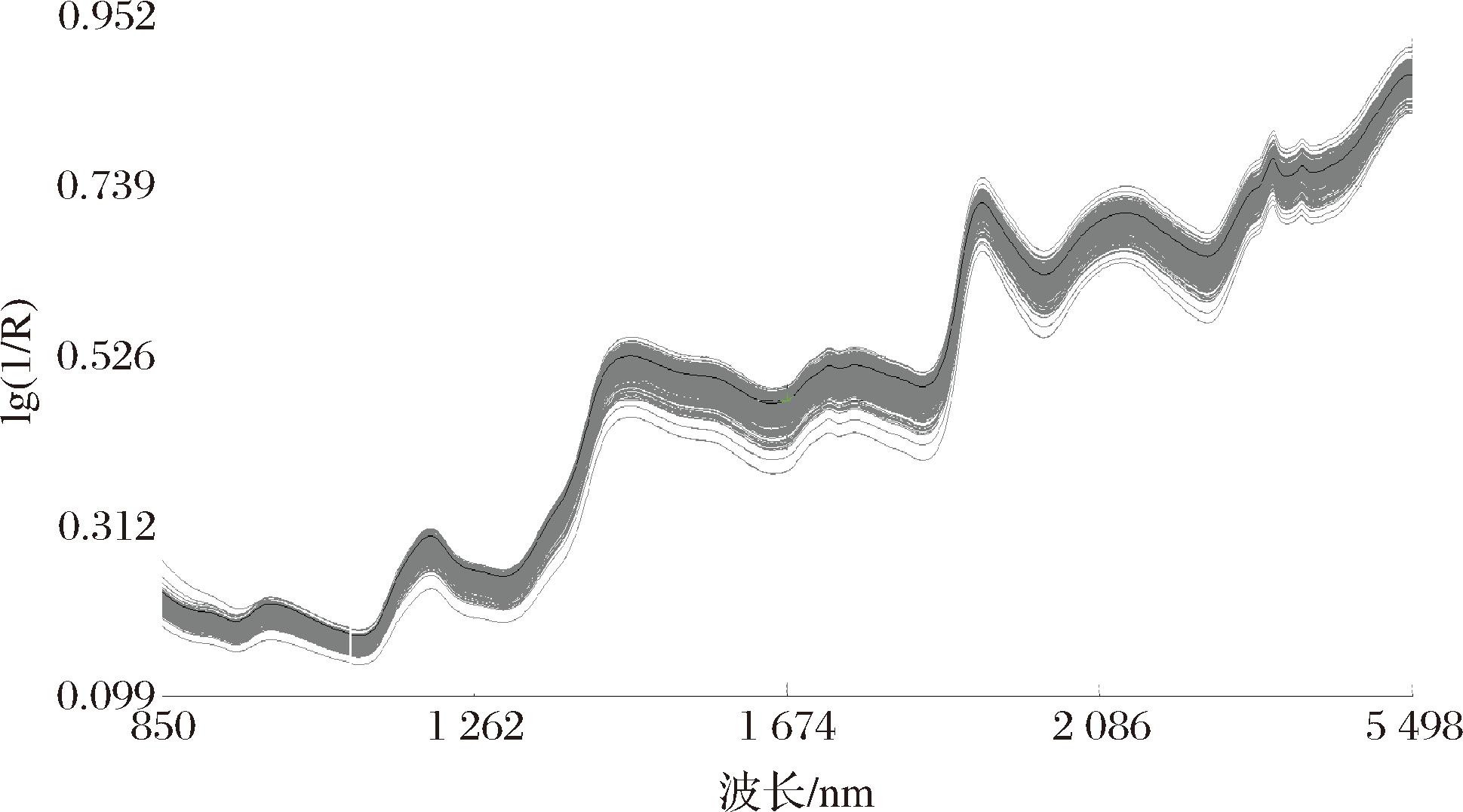 统一装样方式,将高粱样品充分混匀,平铺于干净的样品杯中,装样量约占样品杯2/3,检查杯底无杂质后压实,确保无漏光或大空隙,然后将样品杯置于近红外光谱仪测量池中进行测量,使用光谱采集软件采集样品光谱信息。光谱波长为850~2 450 nm,分辨率为2 nm,每次扫描选取8个点取光谱平均值,重复扫描2次,以提高测量的稳定性和准确性。