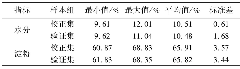 指标样本组最小值/%最大值/%平均值/%标准差水分校正集9.6112.0110.510.61验证集9.6211.0410.481.68淀粉校正集60.8768.8365.913.57验证集61.8368.3565.823.44