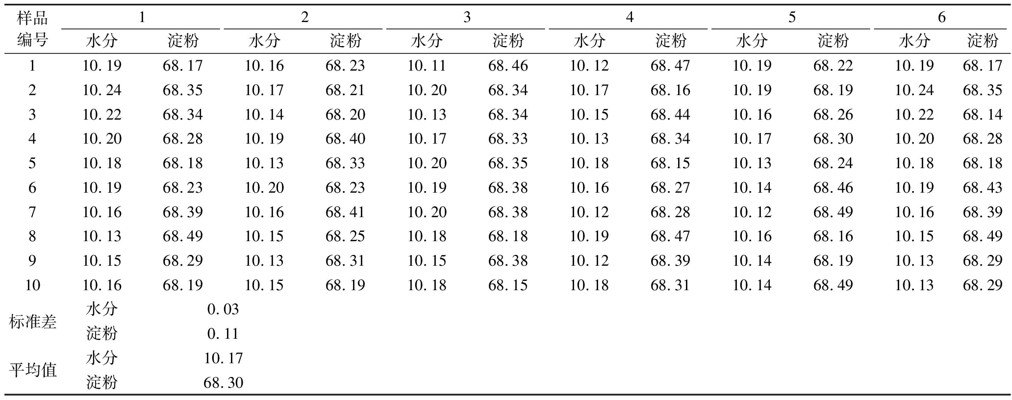随机选取6份高粱样品,利用所建模型重复扫描10次,以验证模型重复性,所得结果如表5所示。通过对比6组重复性实验结果发现,利用该模型预测高粱样品水分、淀粉指标的标准偏差分别为0.03和0.11,表明该模型重复性良好,预测结果具有较高的精密度。