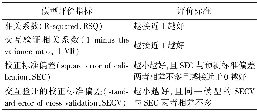 完成初步建模后,通过常规评价指标对模型的质量进行评价,其评价标准见表1。同时,选取30份未参与建模的样品对模型进行准确性盲样验证、6份样品进行重复性盲样验证,即利用所建模型对其进行预测分析,并通过预测结果的分析比较来评价模型的预测能力[16]。