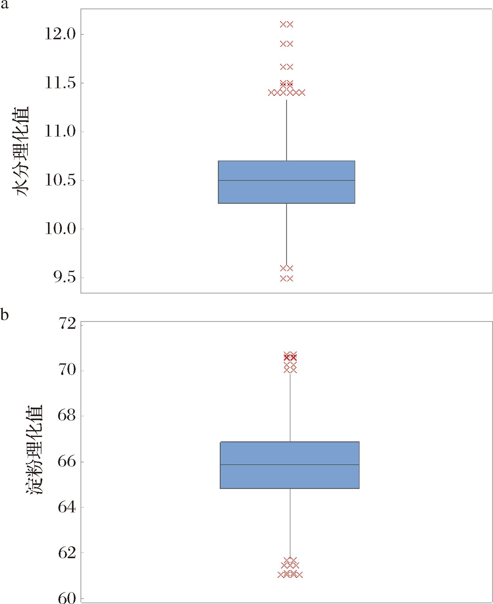 对水分、淀粉理化值进行箱线图(boxplot)分析,结果见图1。定义异常值为超出箱线图上下须(Q1-1.5IQR或Q3+1.5IQR)的样本,对其进行剔除,其中水分须触线区间为9.63~11.33,淀粉触线区间为61.7~69.89,共剔除20个异常样本点。