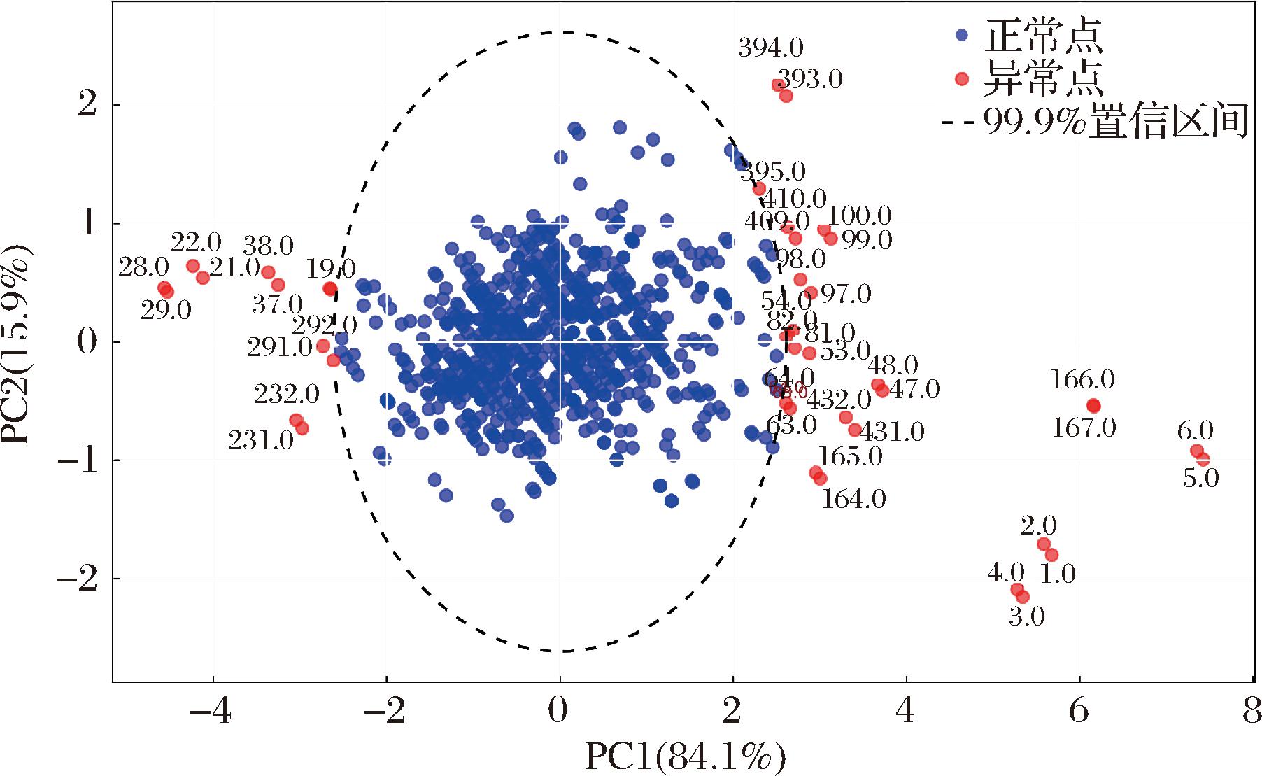 本研究在850~249 8 nm波长对样品进行近红外光谱扫描,在建模之前,对全部样品的近红外光谱数据建立PCA模型(图2),采用Hotelling T2检验检查光谱数据,剔除99.9%置信区间之外的样本点,即共计剔除掉41个异常样本点。