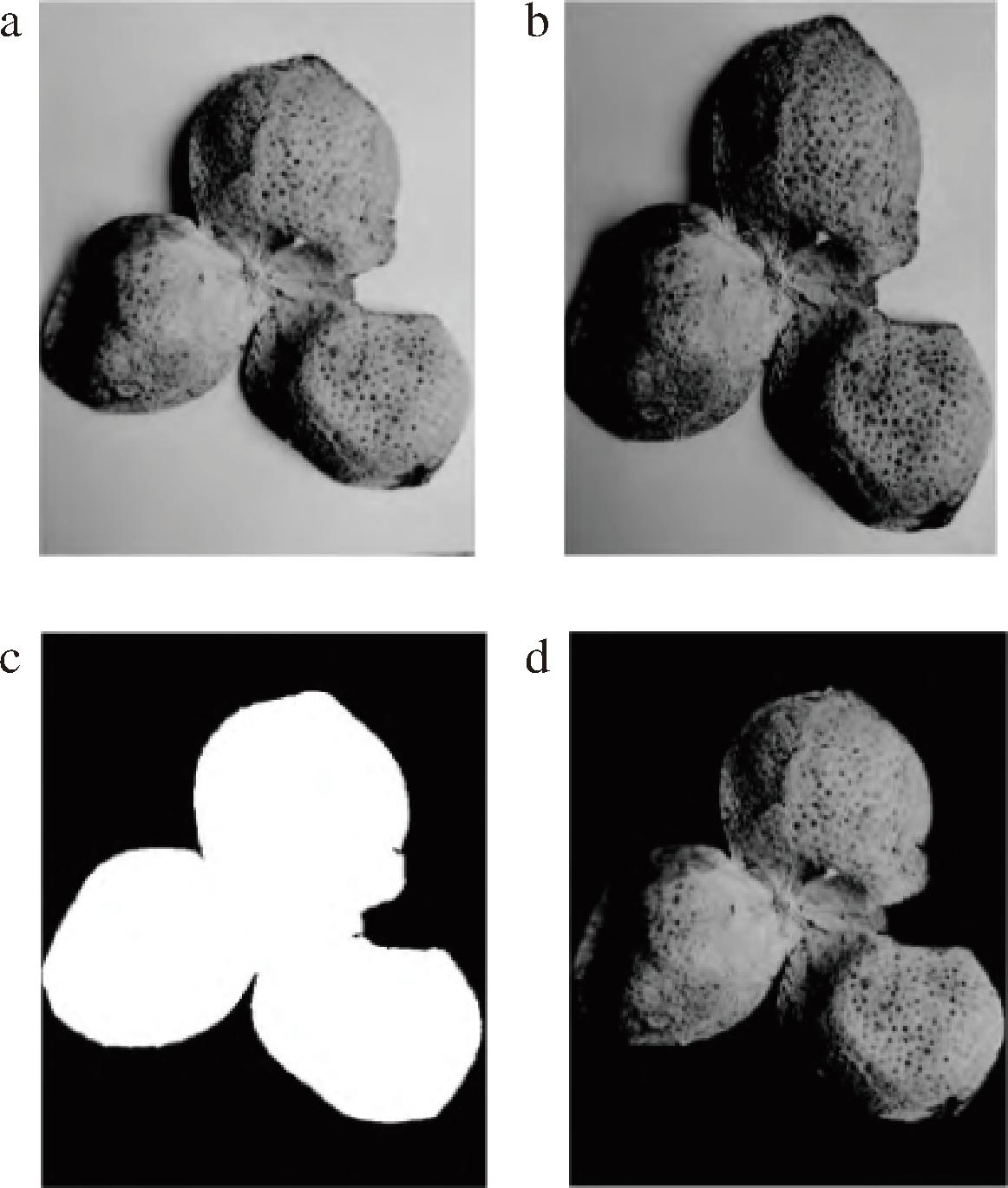 a-原始图;b-灰度图;c-阈值分割图;d-目标图像